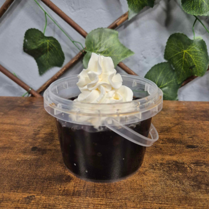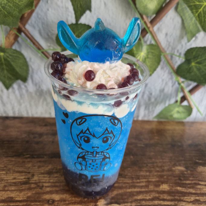 Smothie a base de agua super especial sabor mora azul con perlas especiales de stich, mermelada y crema batida.