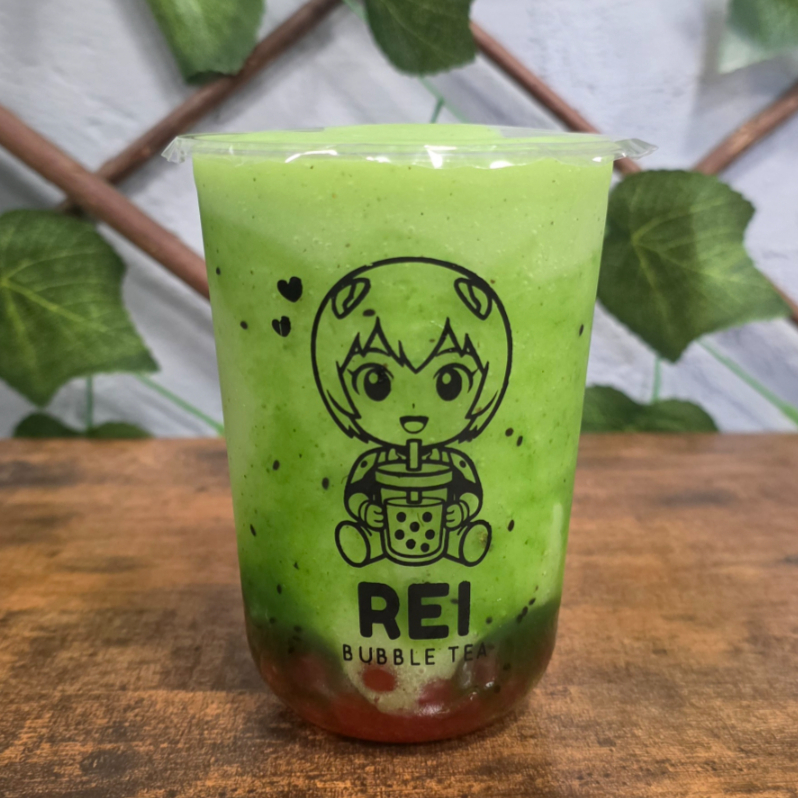 Smothie de 12oz a base de agua sabor manzana con kiwi, perlas explosivas de fresa y jarabe de kiwi