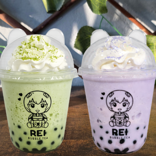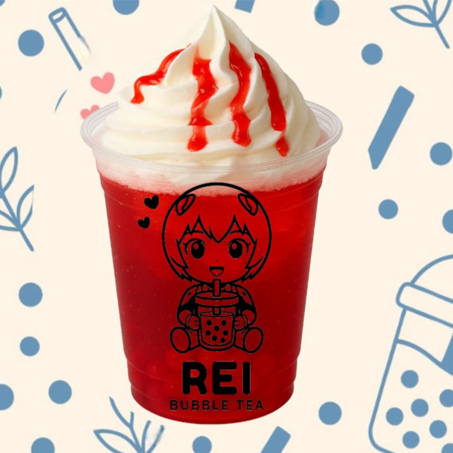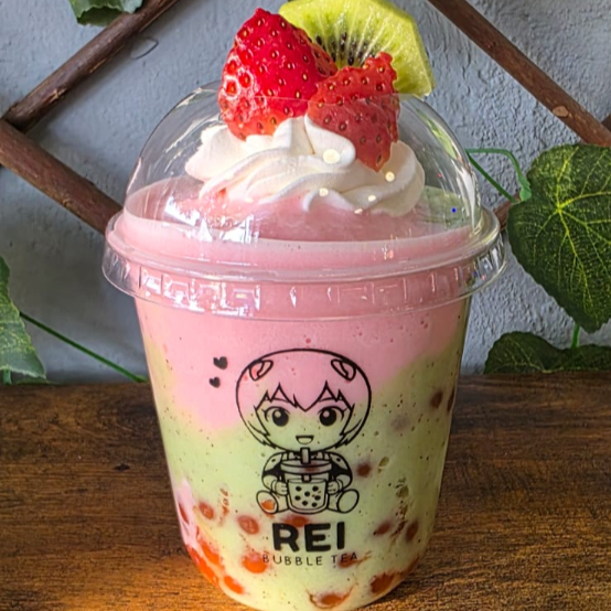 Bebida de 12oz, tipo frappe a base de leche sabor frutas con perlas explosivas de fresa, jarabe de kiwi y crema batida vegetal