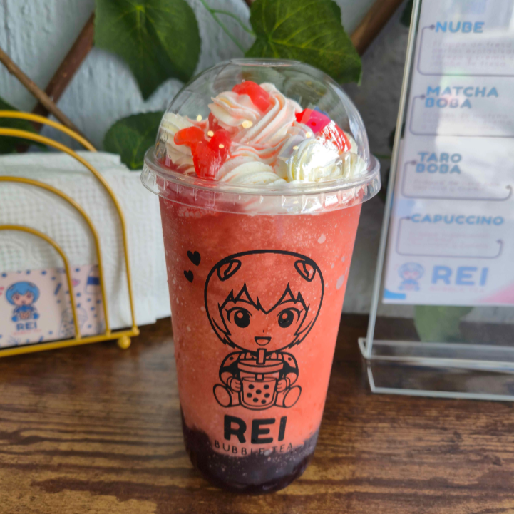 Bebida de 12 oz tipo frappe a base de leche con fresa natural, chocolate, perlas de tapioca y crema batida vegetal