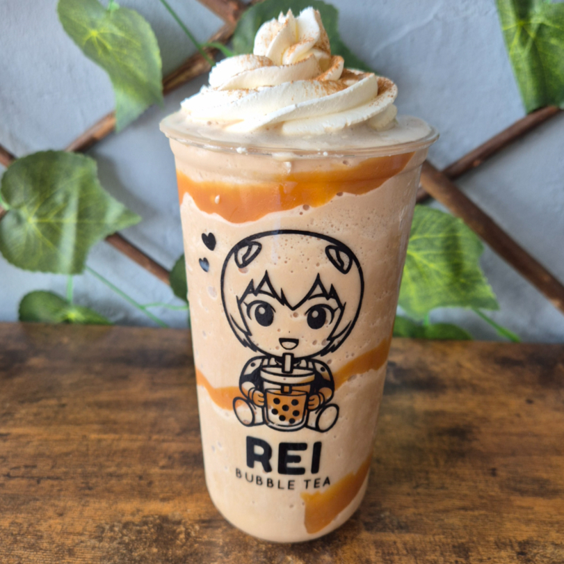 Frappe de 12 oz a base de leche sabor Chai vainilla, jarabe de chocolate y crema batida vegetal