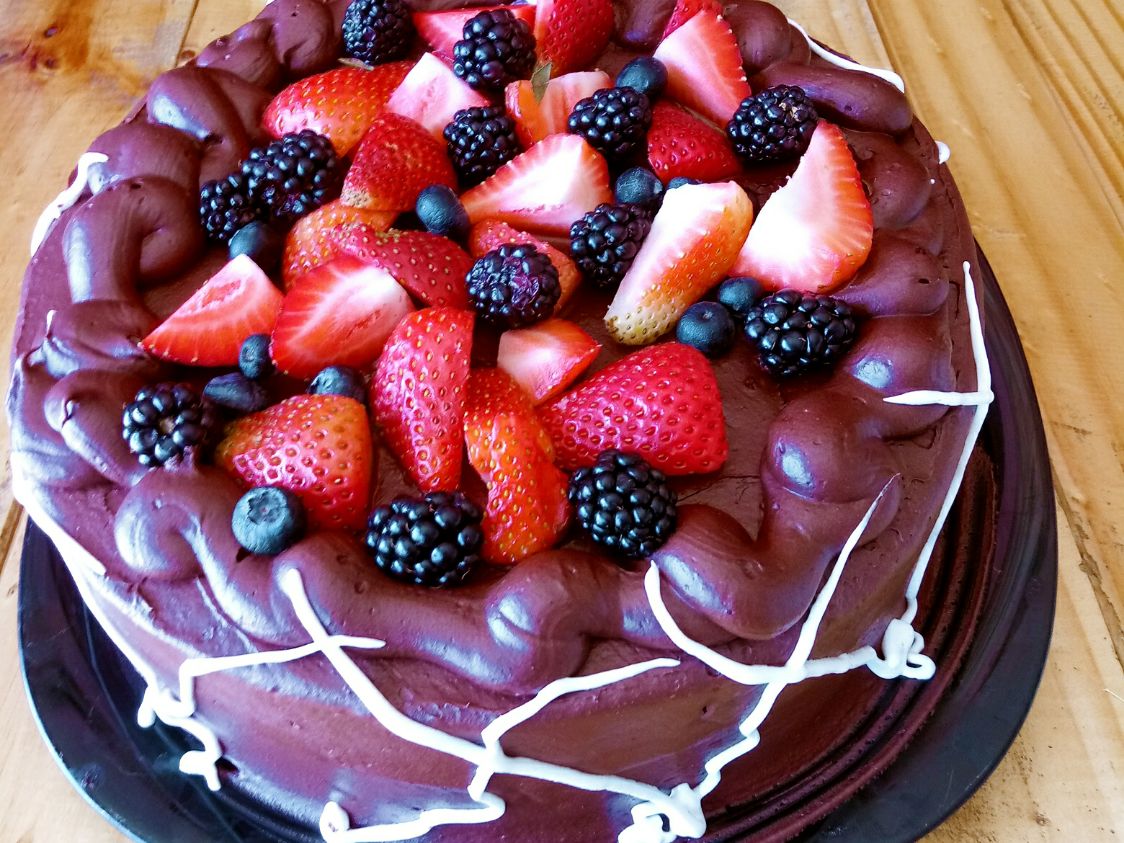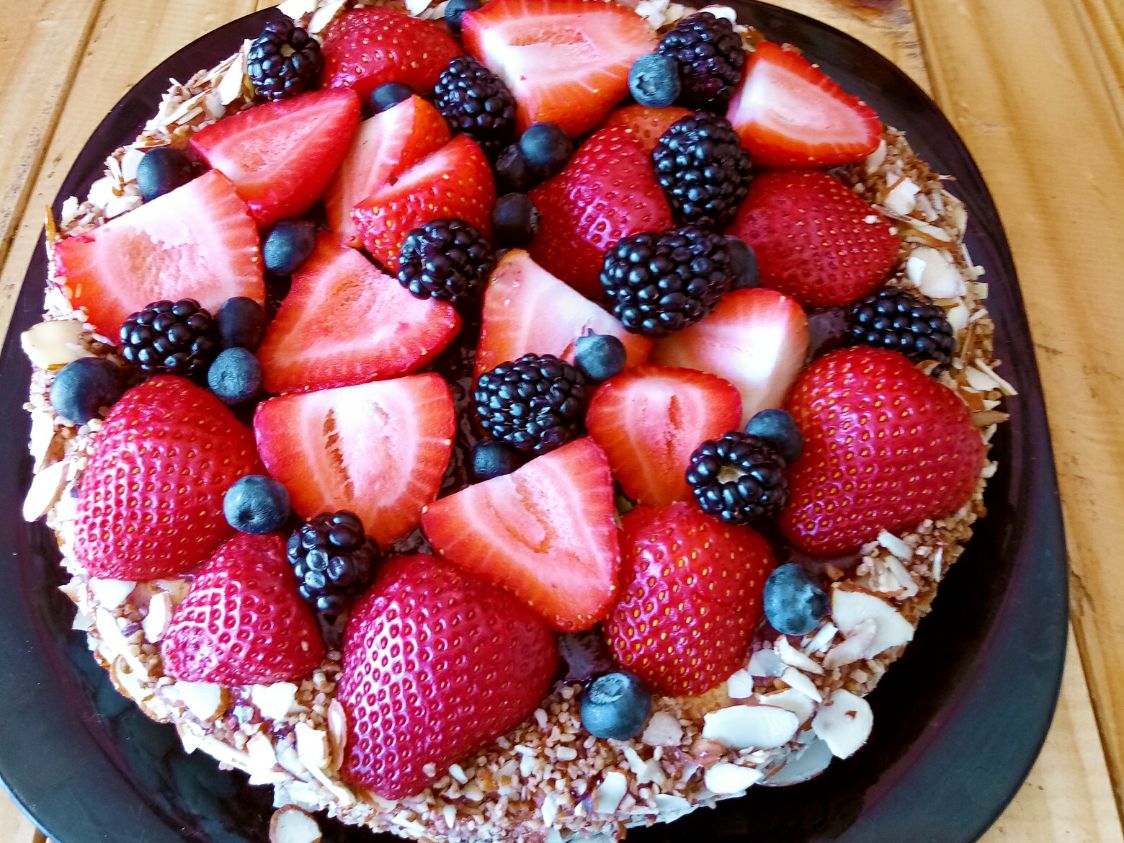 Delicioso postre a base de galleta, queso horneado, mermelada de zarzamora, decorado con frutos rojos, Rinde de 12 a 14 personas.