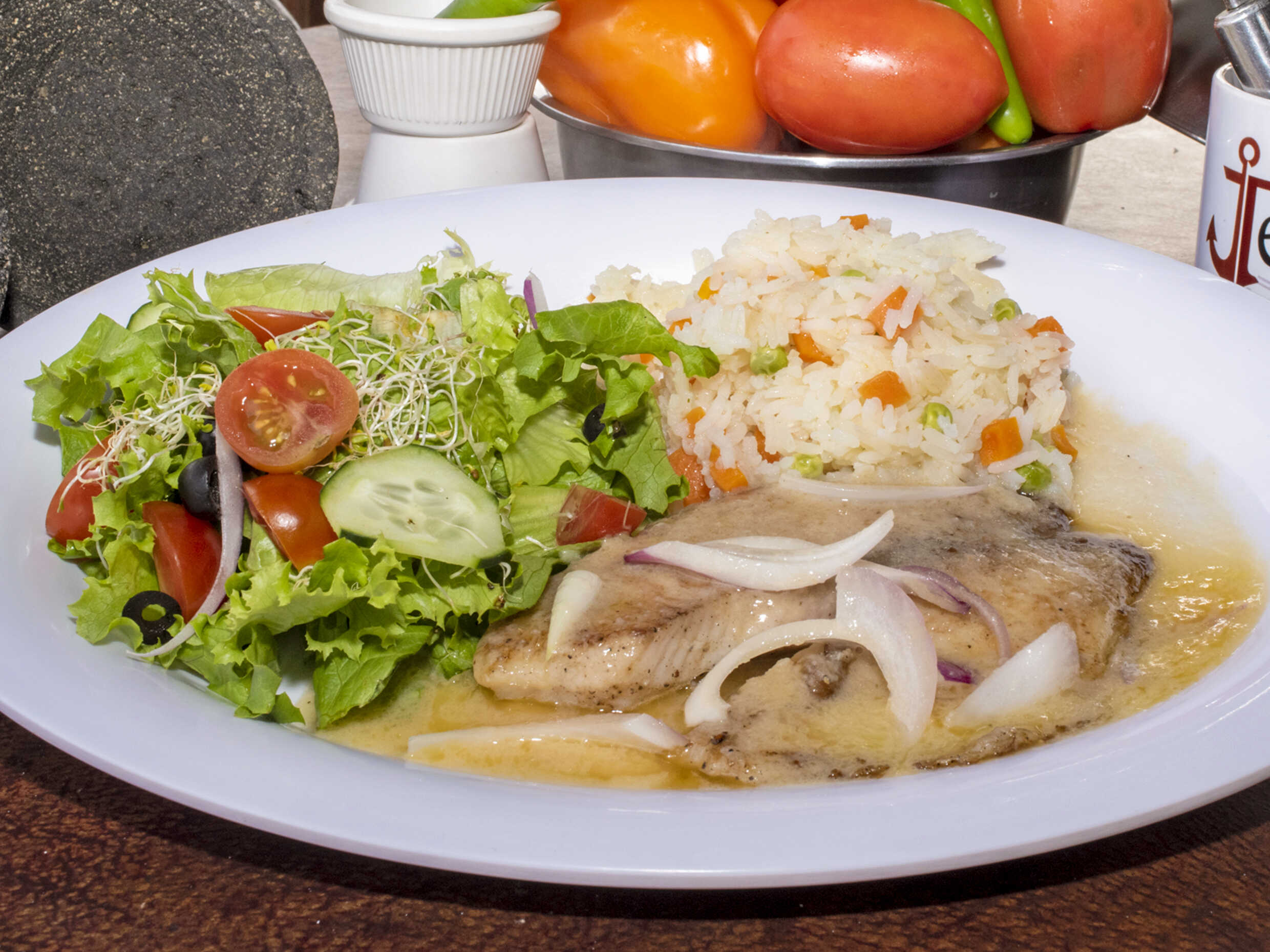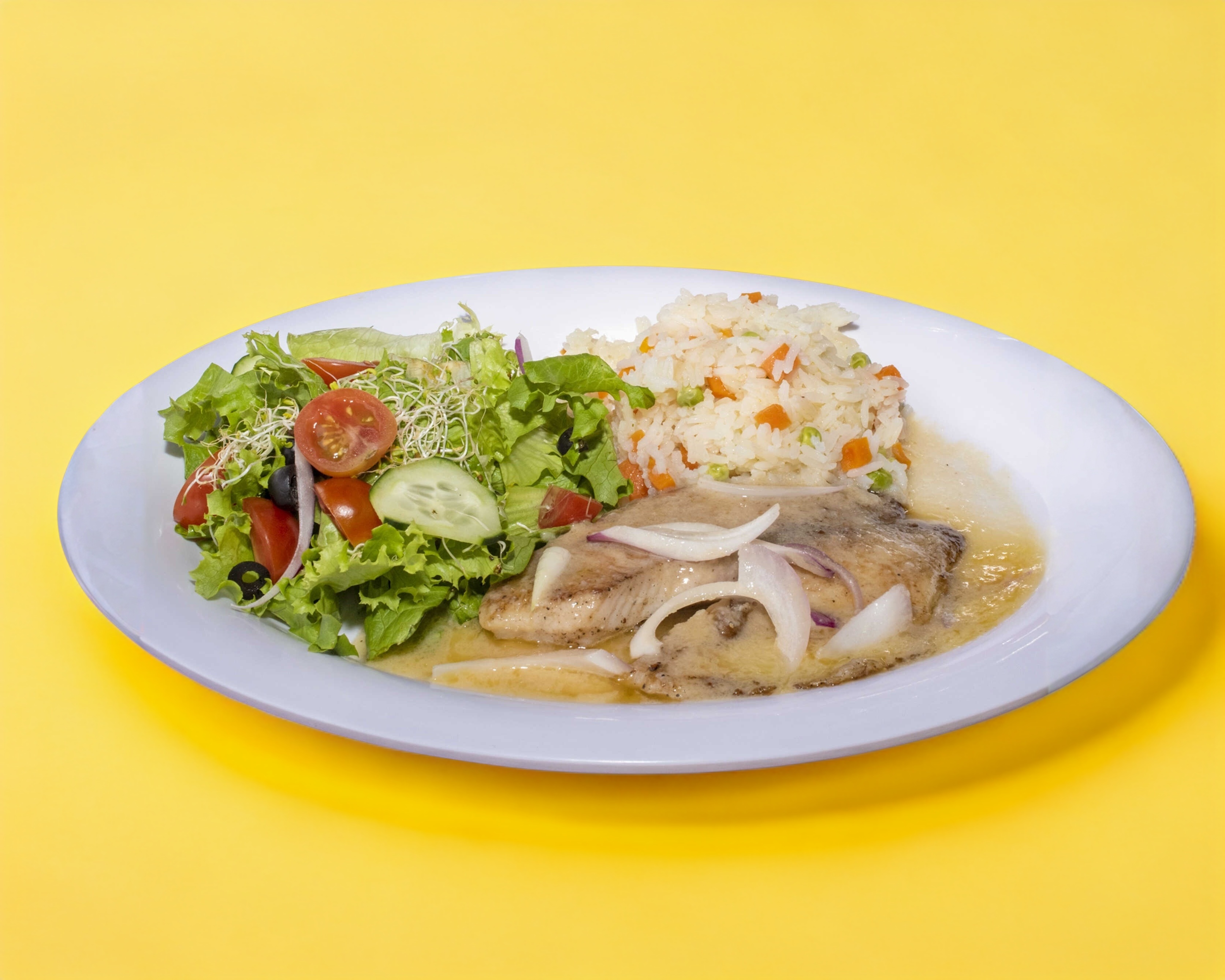 Filete de Pescado al gusto acompañado de arroz y ensalada.