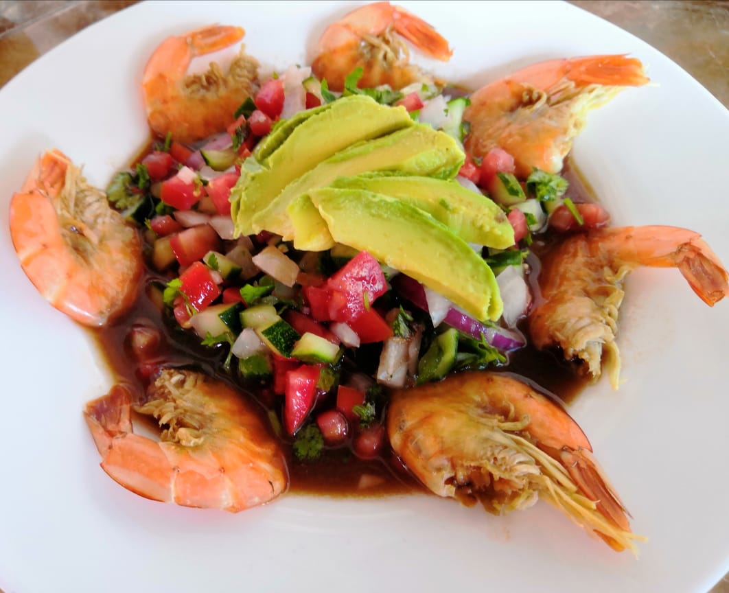 Camarones con aguacate y guarnición de pepino y cebolla morada.