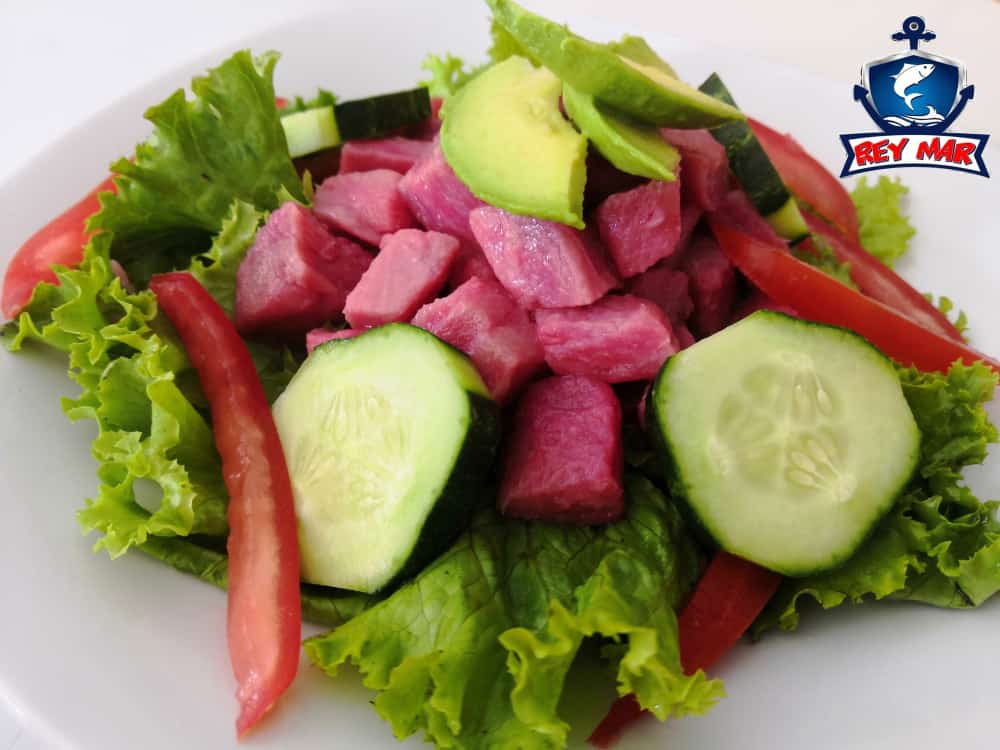100Gr de medallón de atún curtido en limón, acompañado de vinagreta, lechuga italiana, cebolla, jitomate y pepino.