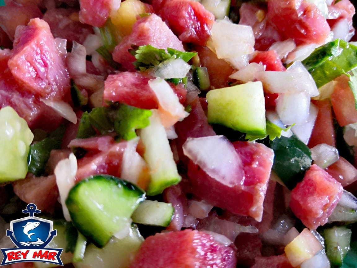 Atún fresco curtido en limón acompañado de salsa de aguachile estilo Rey Mar.