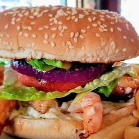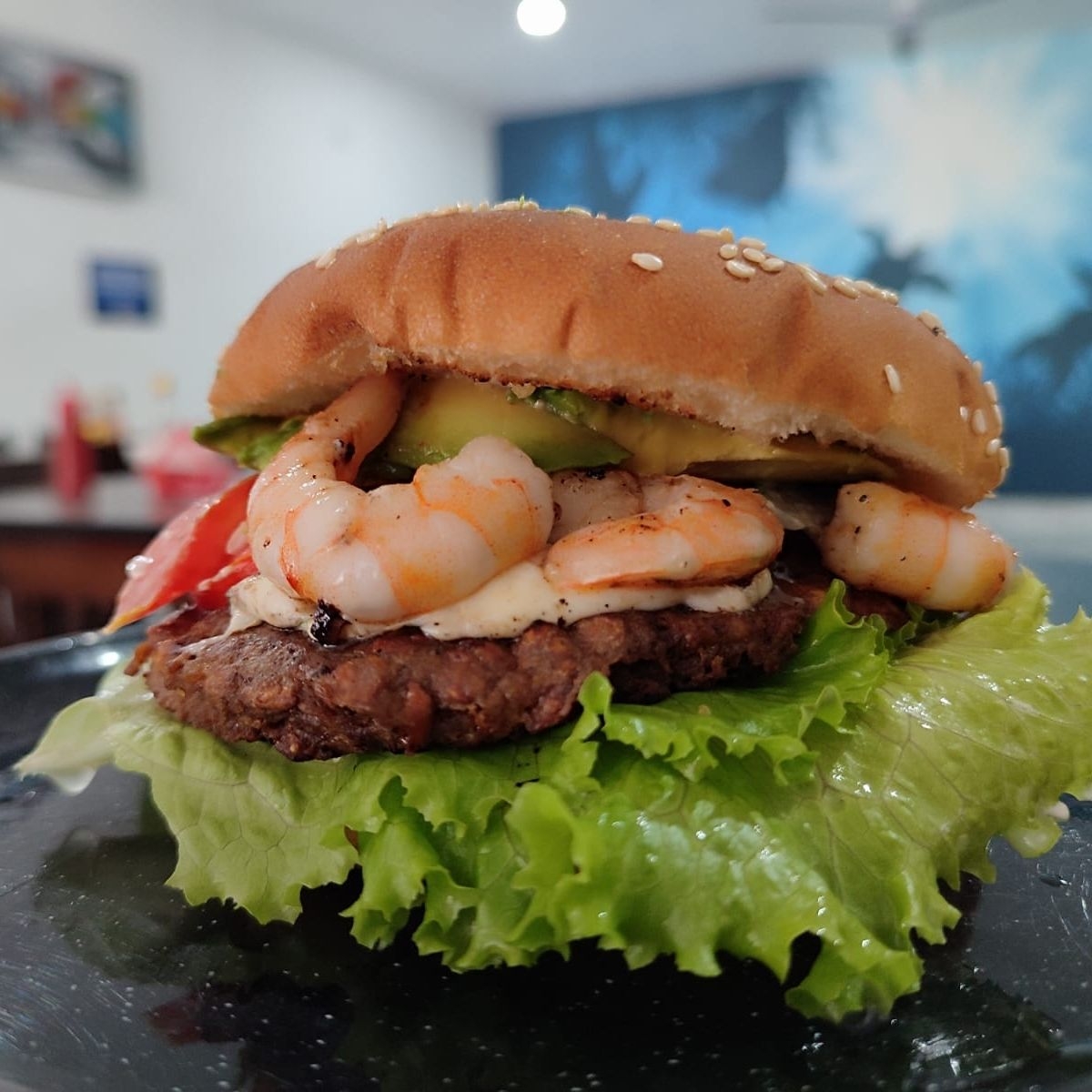 Nueva hamburguesa con camarones a la plancha y queso blanco gratinado