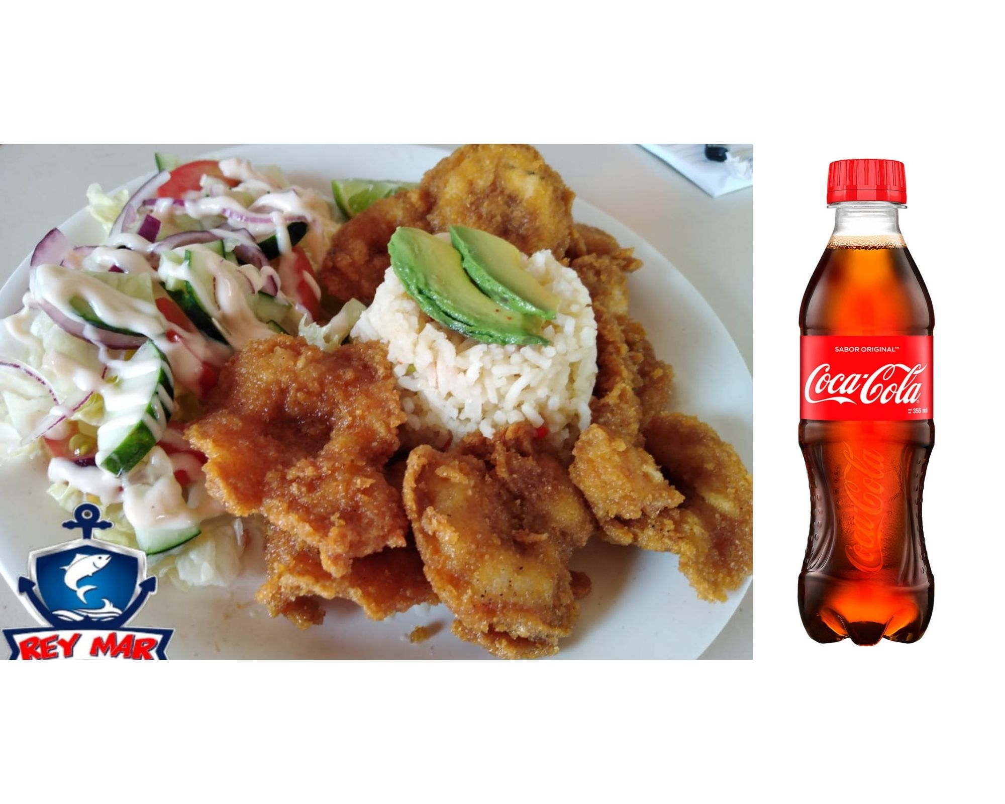 Platillo camarones empanizados acompañado de arroz y ensalada