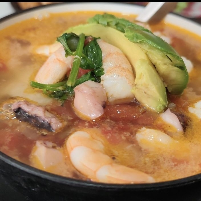 Caldo de mariscos preparada al momento con filete de pescado , camarón , pulpo y aros de calamar . Un litro