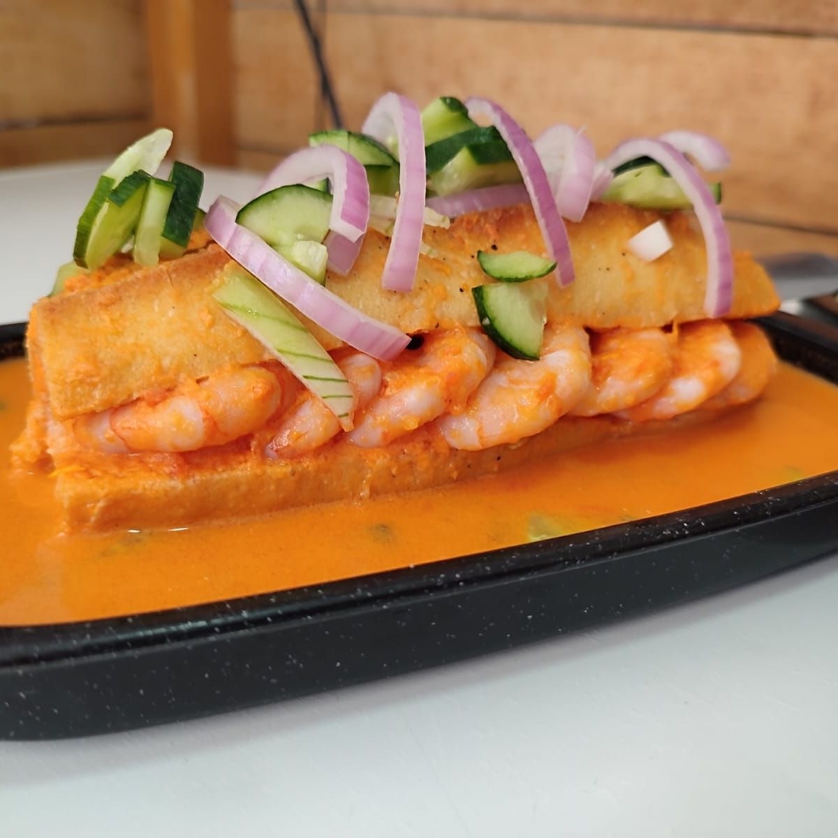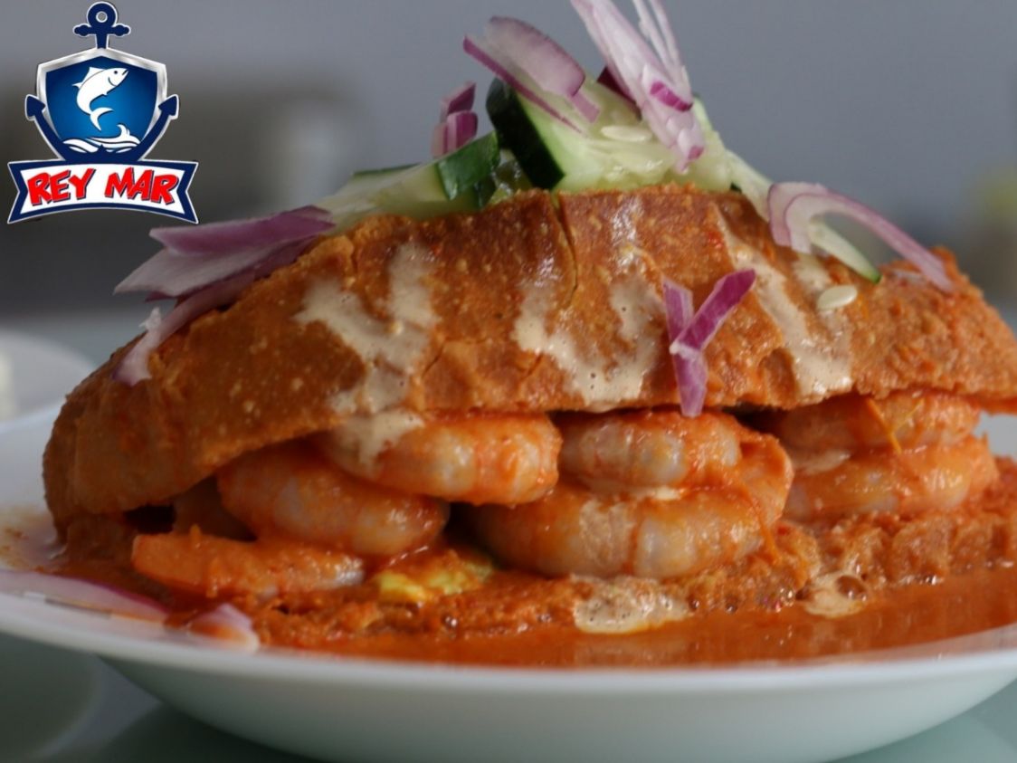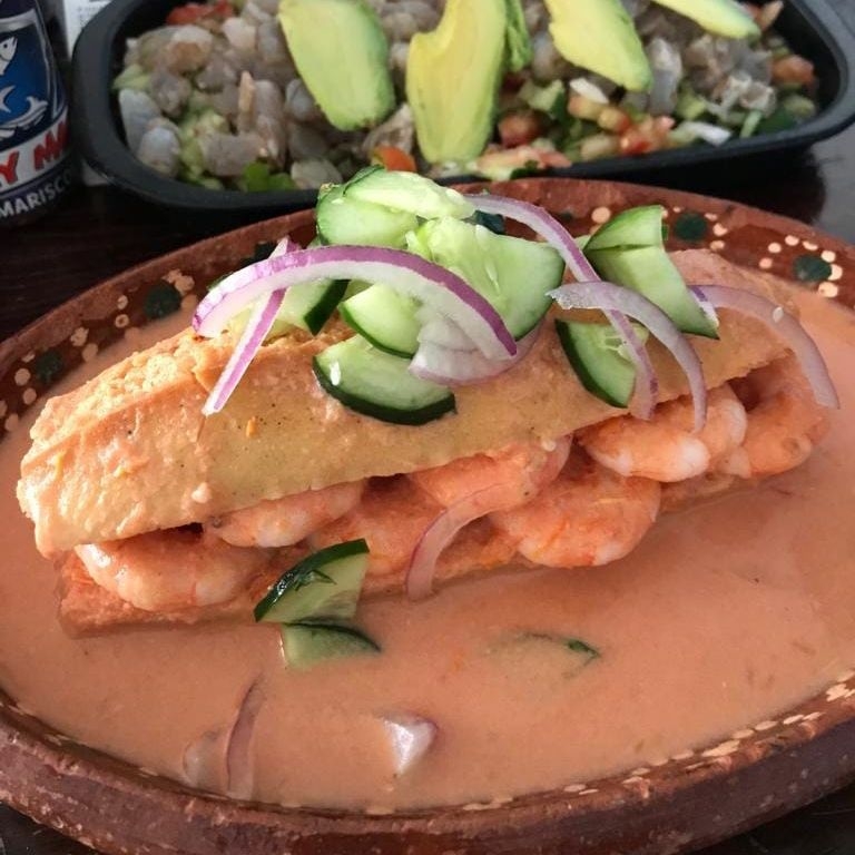 Torta ahogada de camarón y marlin guisado acompañada de nuestra tradicional salsa aderezada