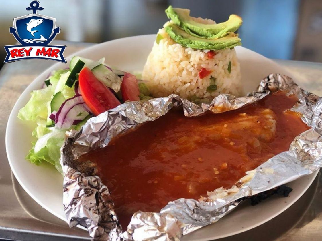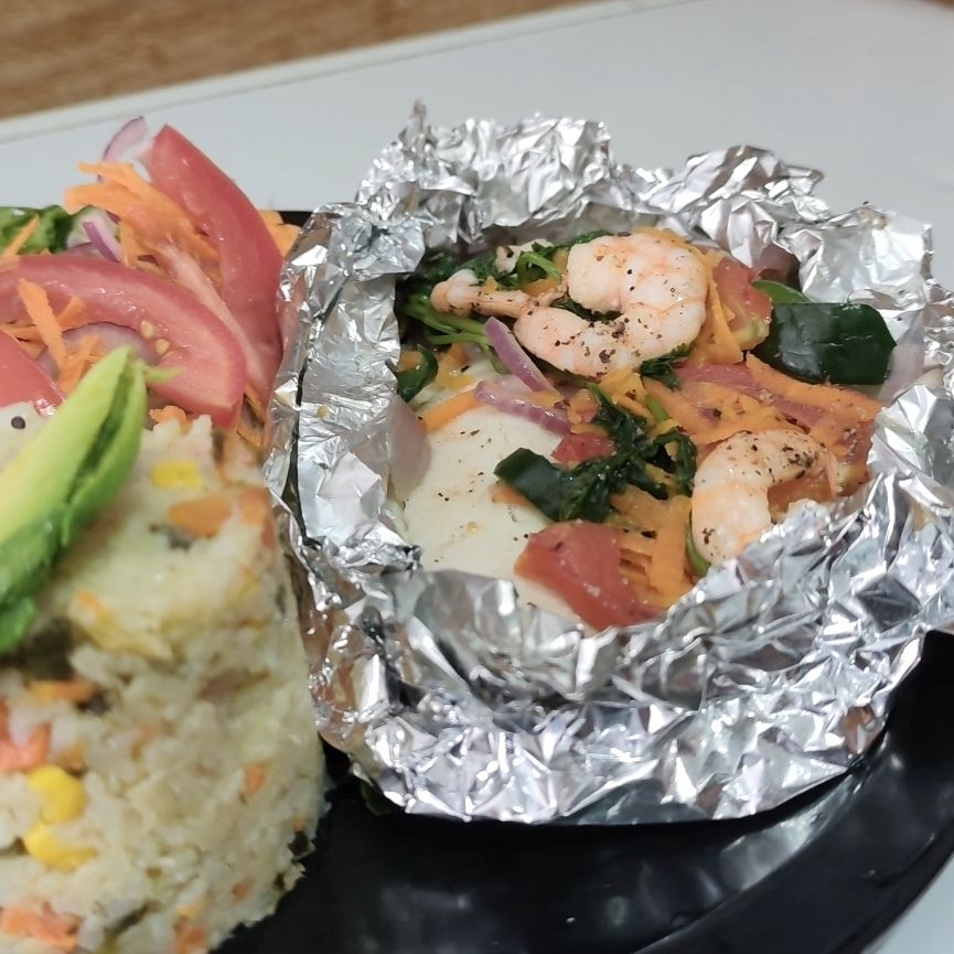 Envuelto en papel aluminio, al vapor con camarones y verdura, acompañado de arroz y ensalada