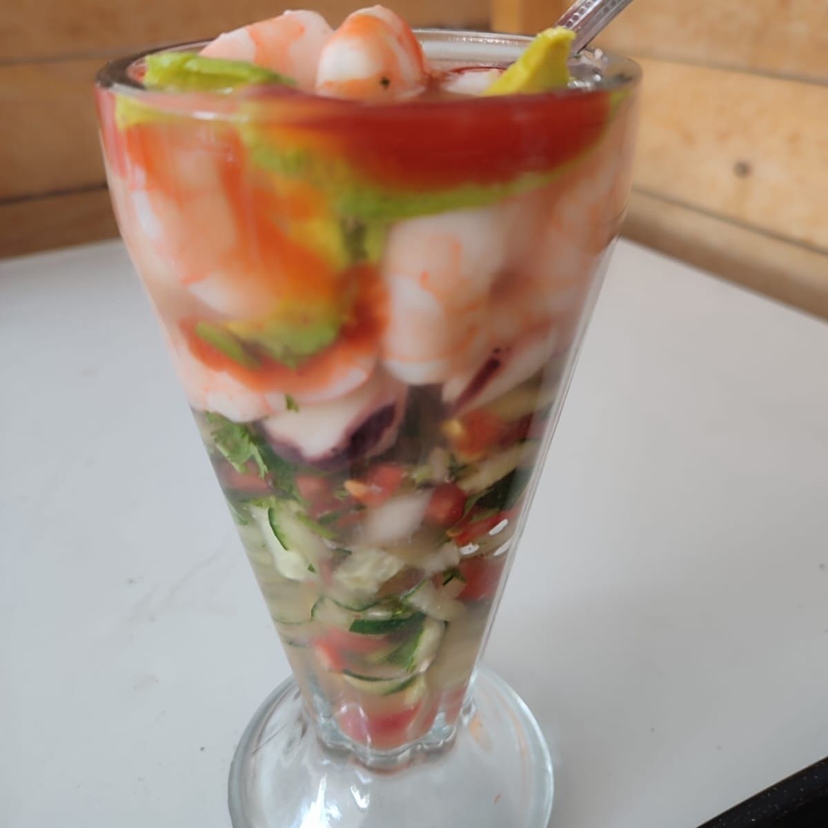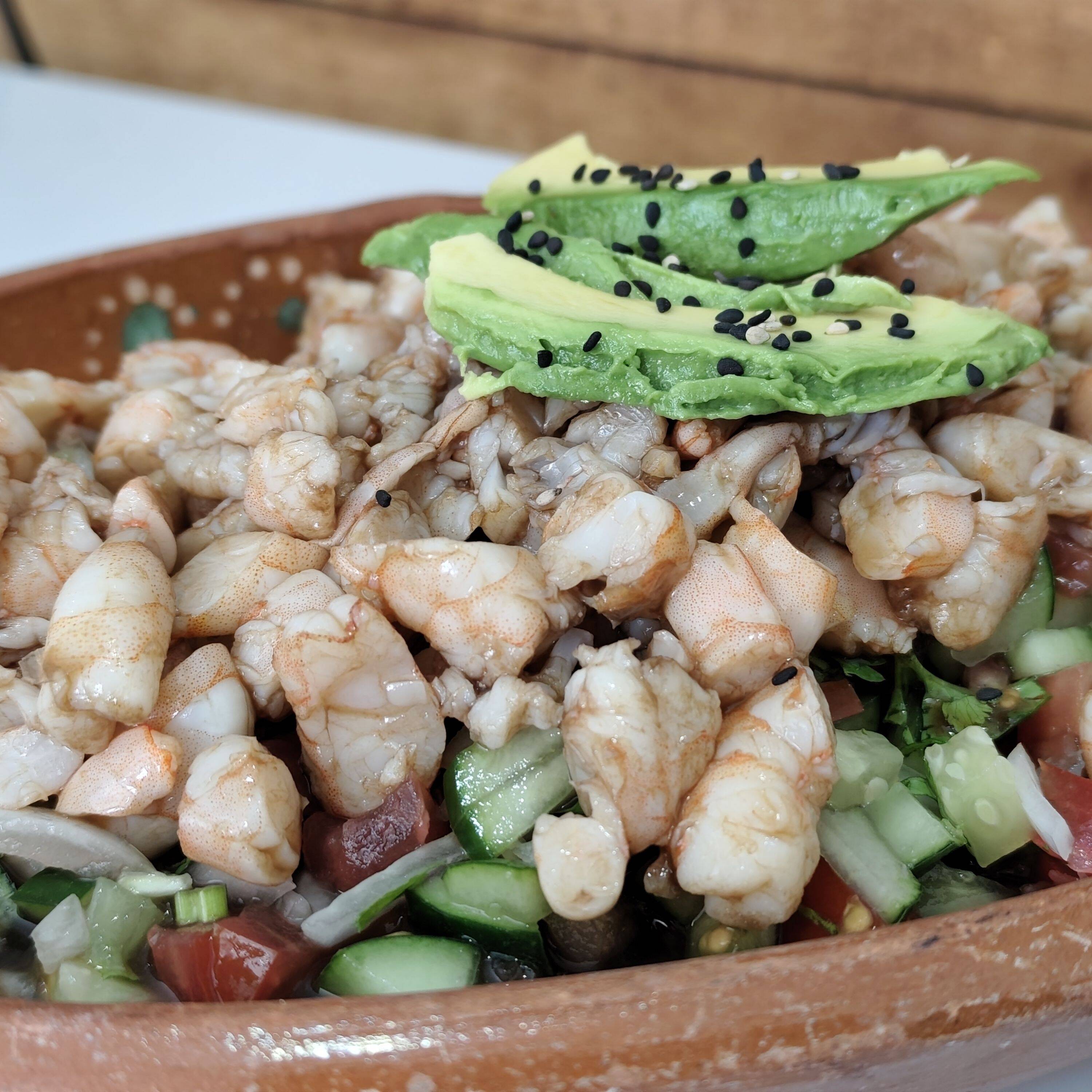 Ceviche de camarón cocido combinación de salsas de la casa con un toque de clamato casero y cátsup.