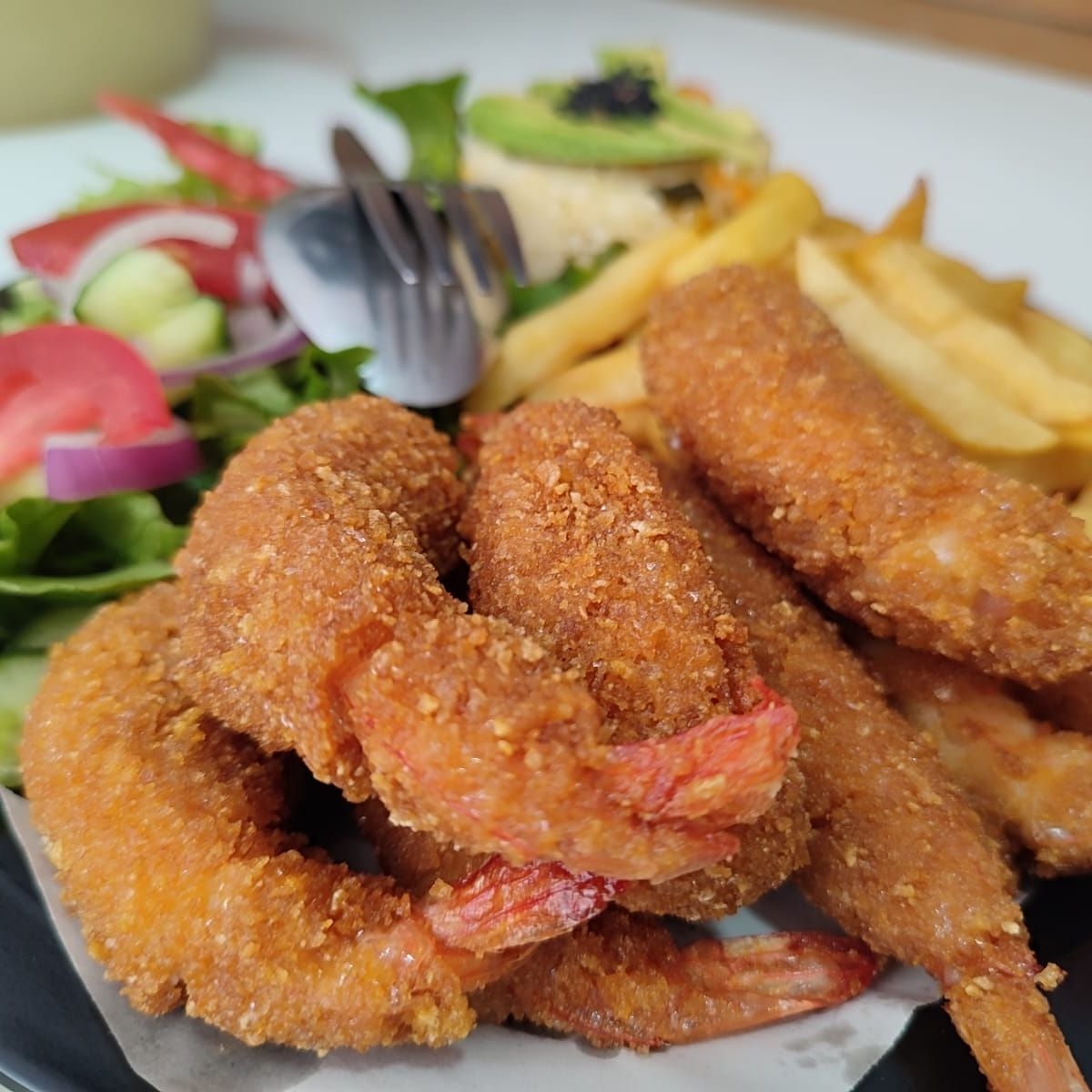 Acompañada de papas a la francesa ricos camarones empanizados y lechuga italiana.