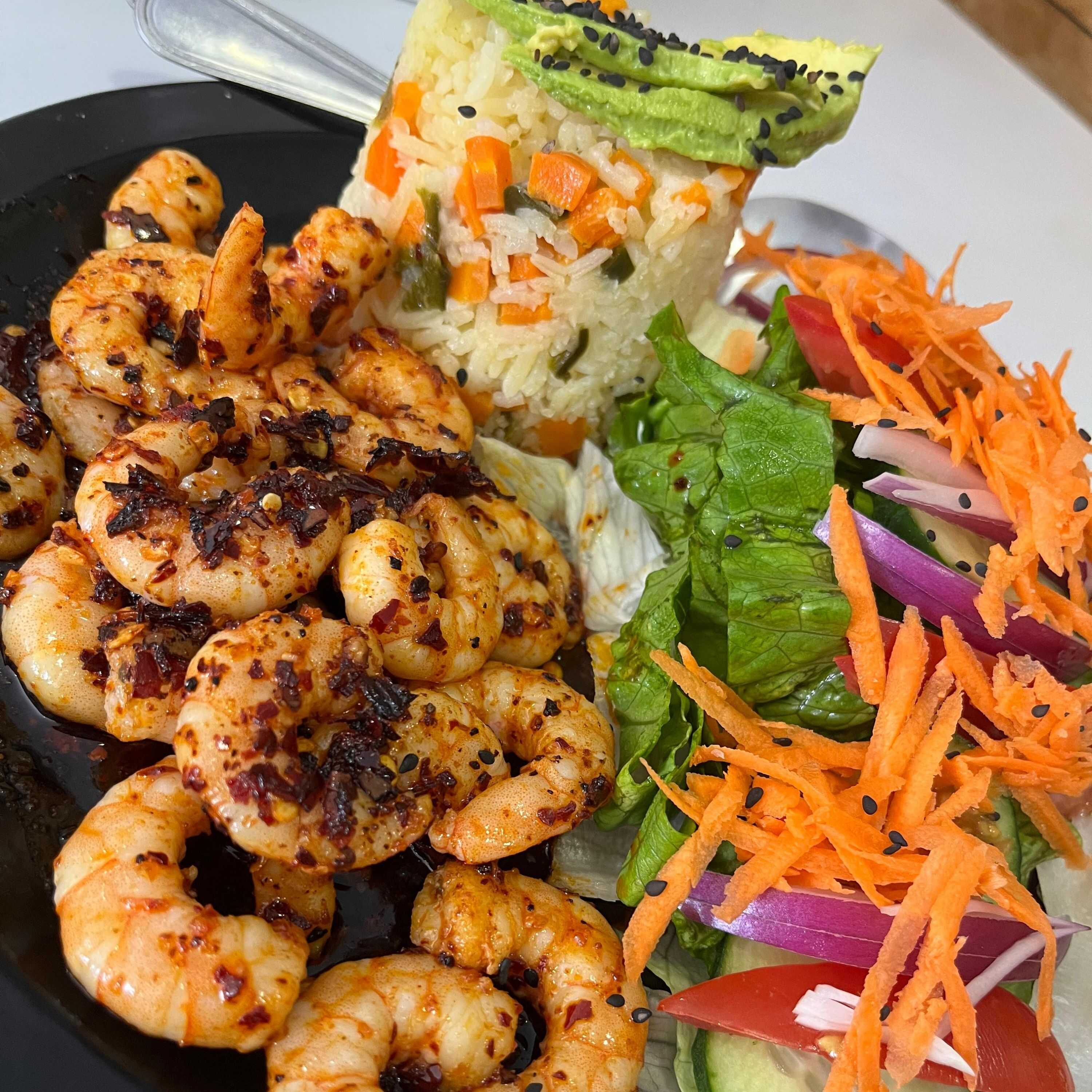 Camarones al mojo de ajo Acompañado de arroz y ensalada