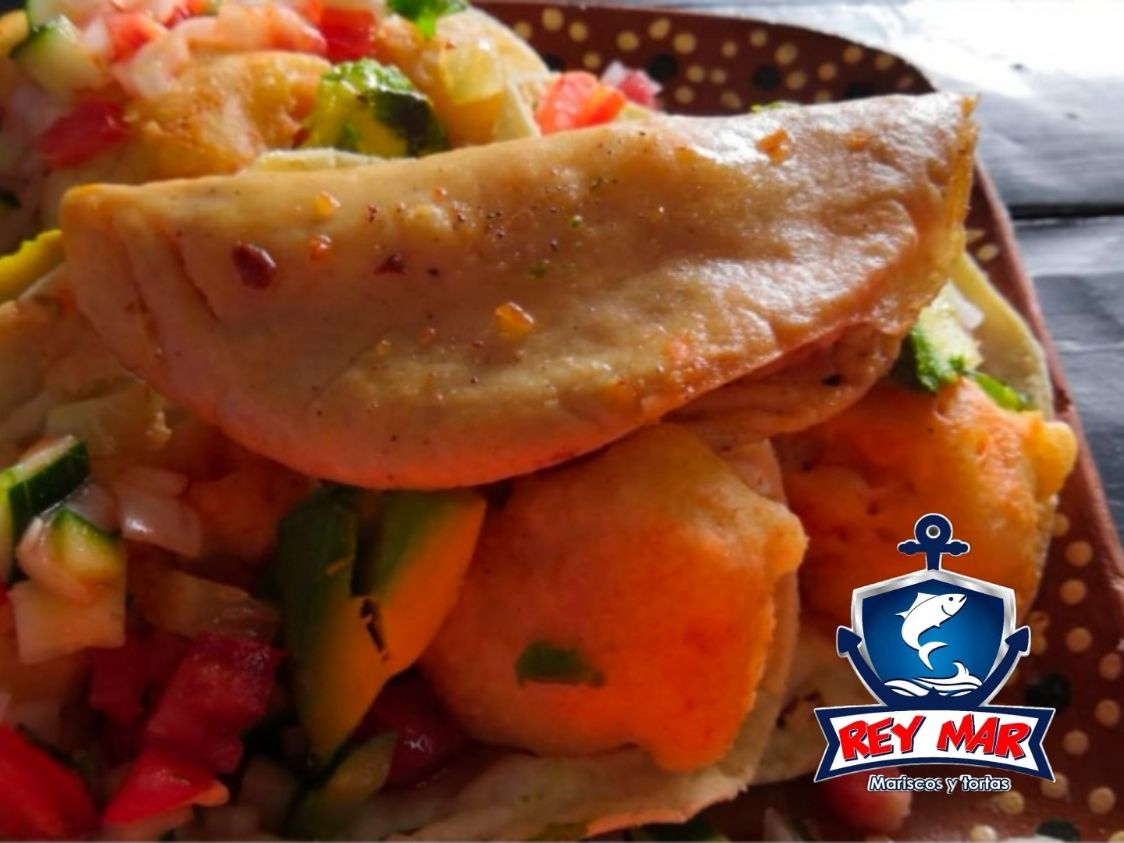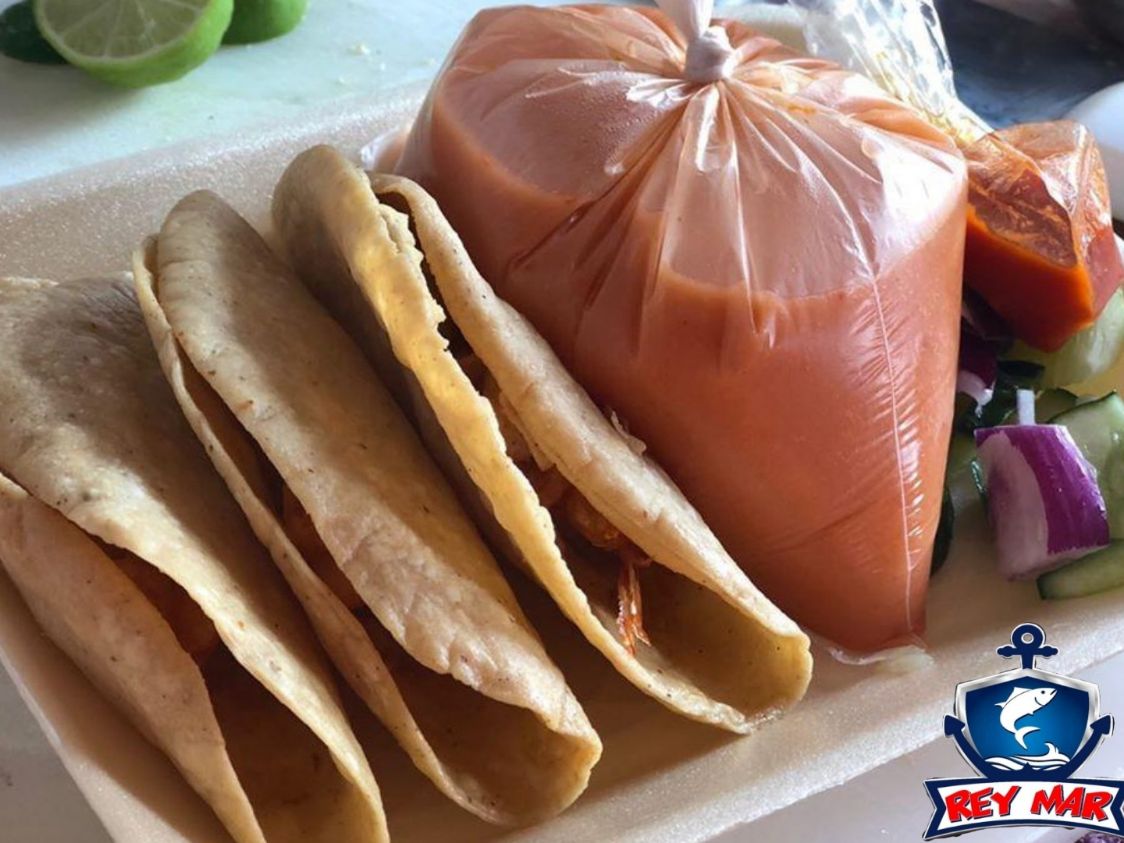 Tacos de camarón elaborados con un guiso y queso gratinado además de salsa para zarandear