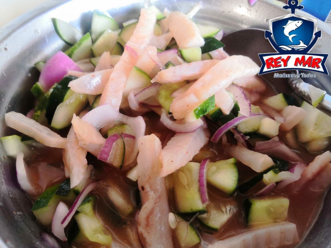 Tiras de pescado curtidas en limón, pepino, cebolla morada con un toque de salsas de la casa.