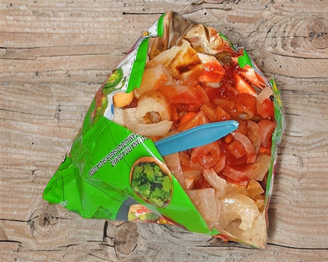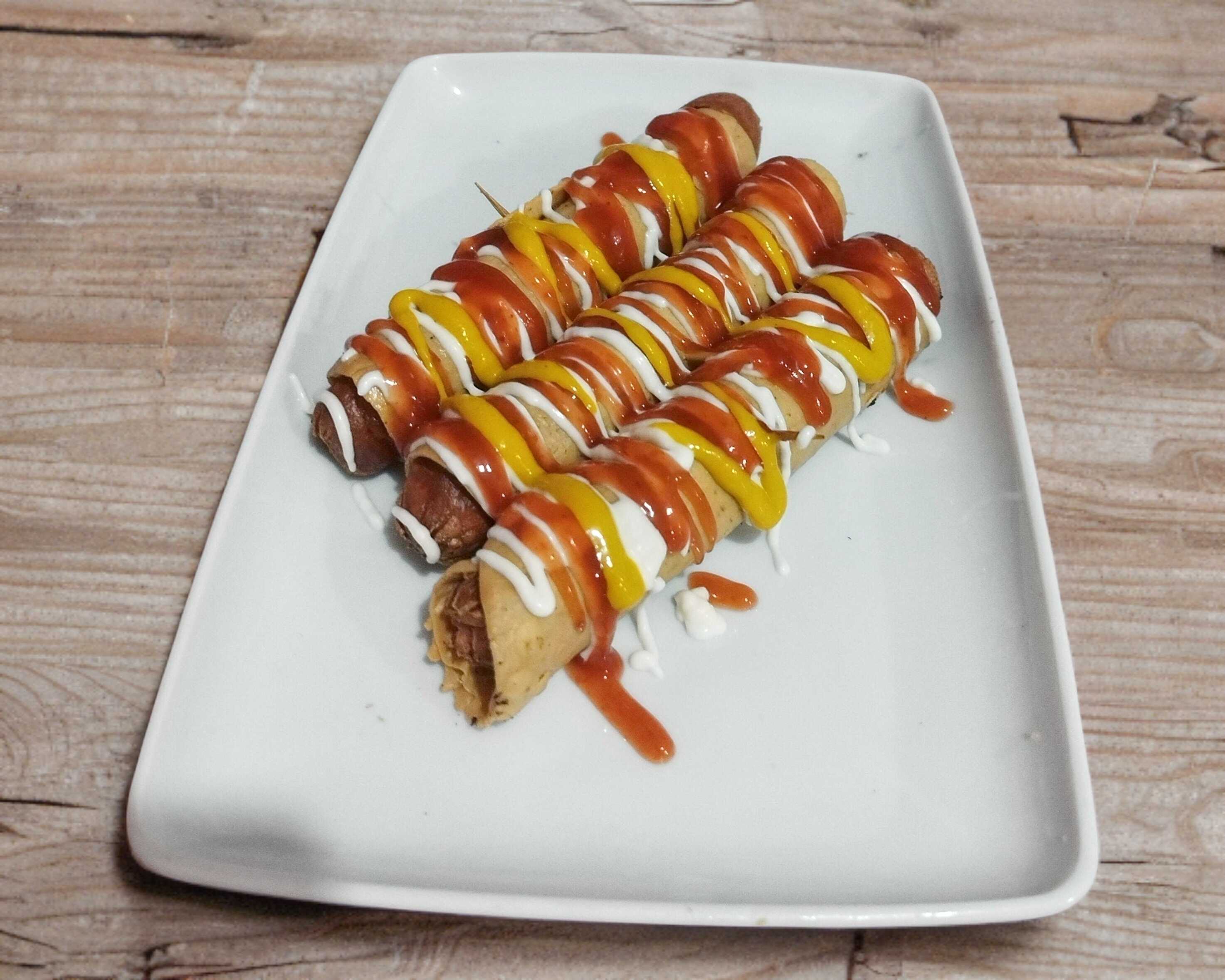 200 gr de salchichas envueltas en tortilla de maíz con aderezos.