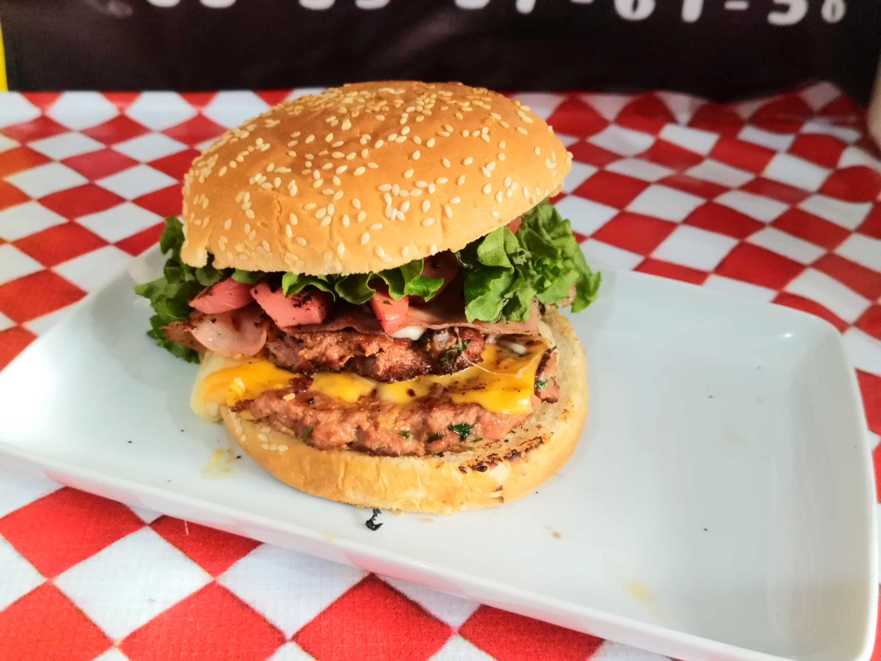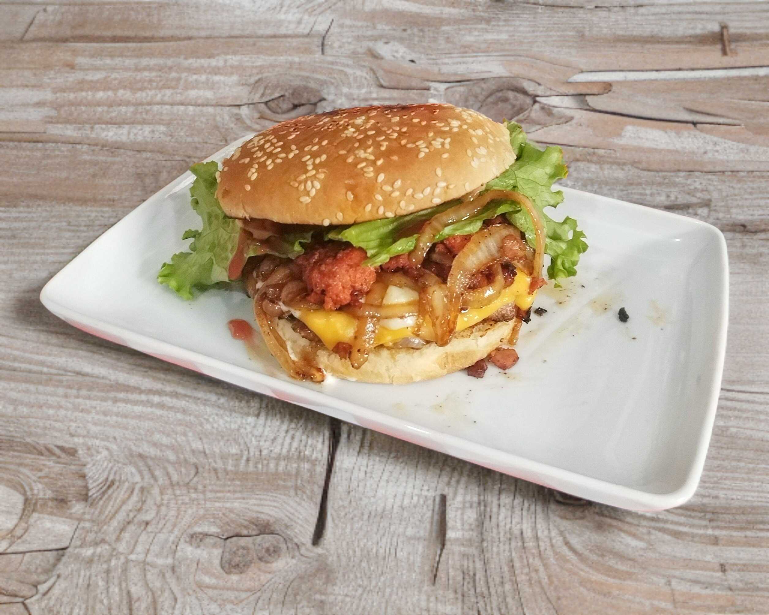100gr de carne de res con aderezo,queso amarillo ,queso blanco, cebolla guisada ,chorizo, tocino,verdura