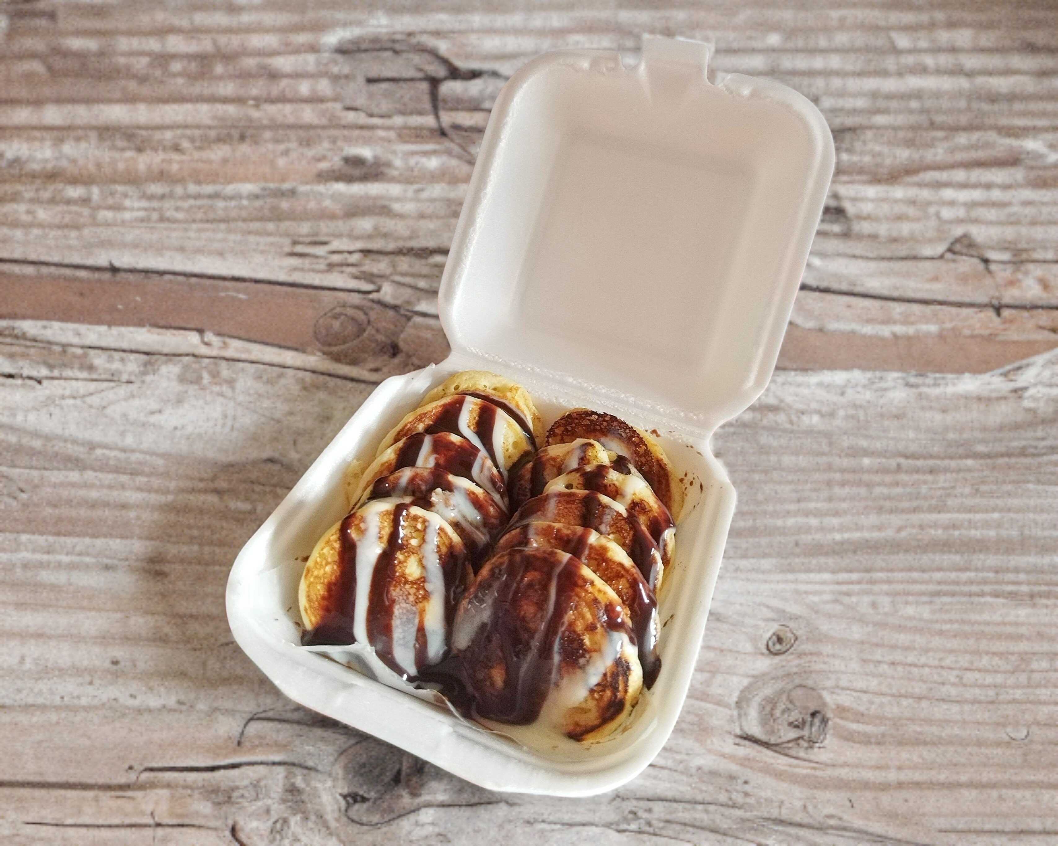 12pzs de mini hot cakes acompañados de mermelada, jarabe de chocolate, lechera, cajeta o miel.