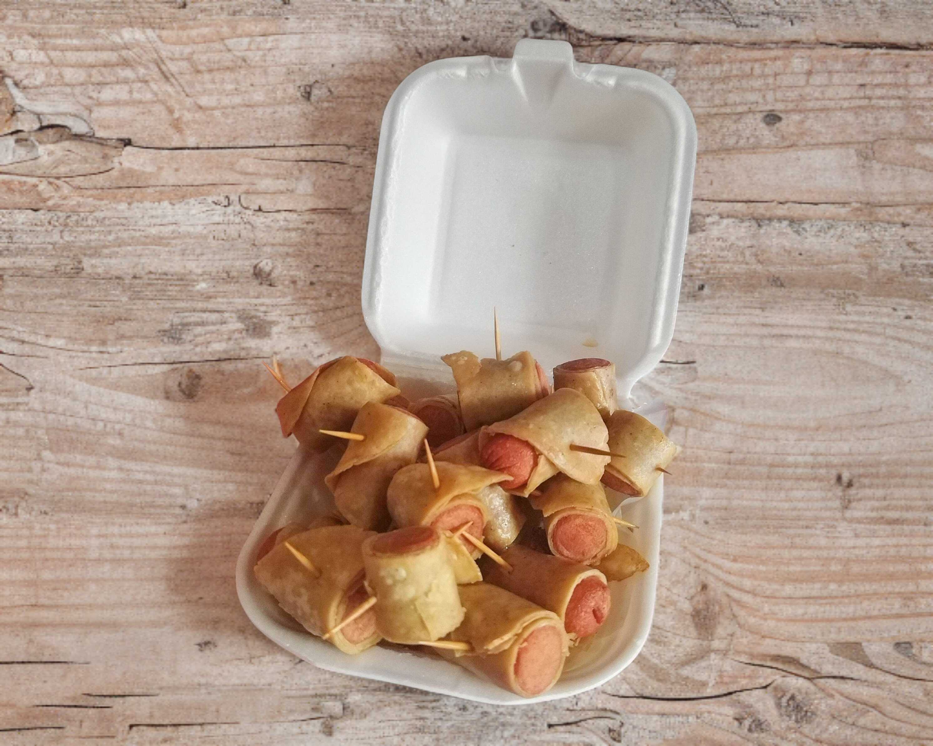 200 gr de bolitas de salchicha envueltas cómo Banderillas fritas con aderezos.