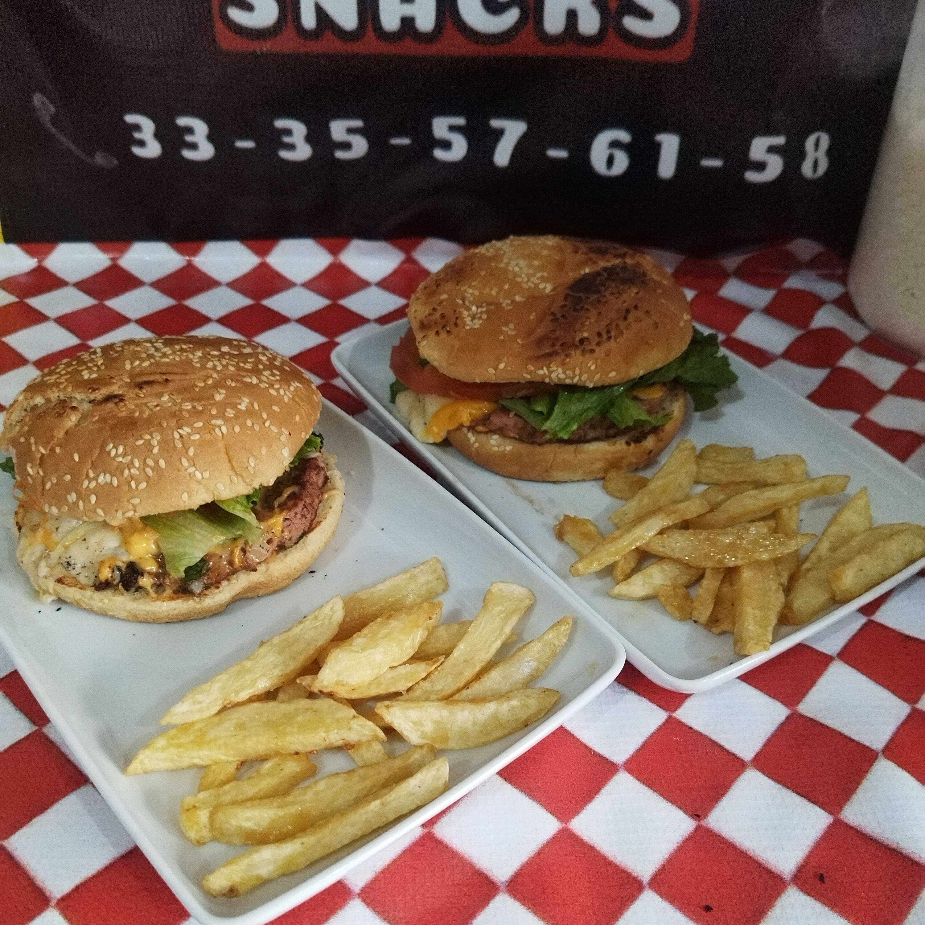 2Hamburguesas hawaianas,queso amarillo,jamon y piña con papas a la francesa mas 2 aguas de medio