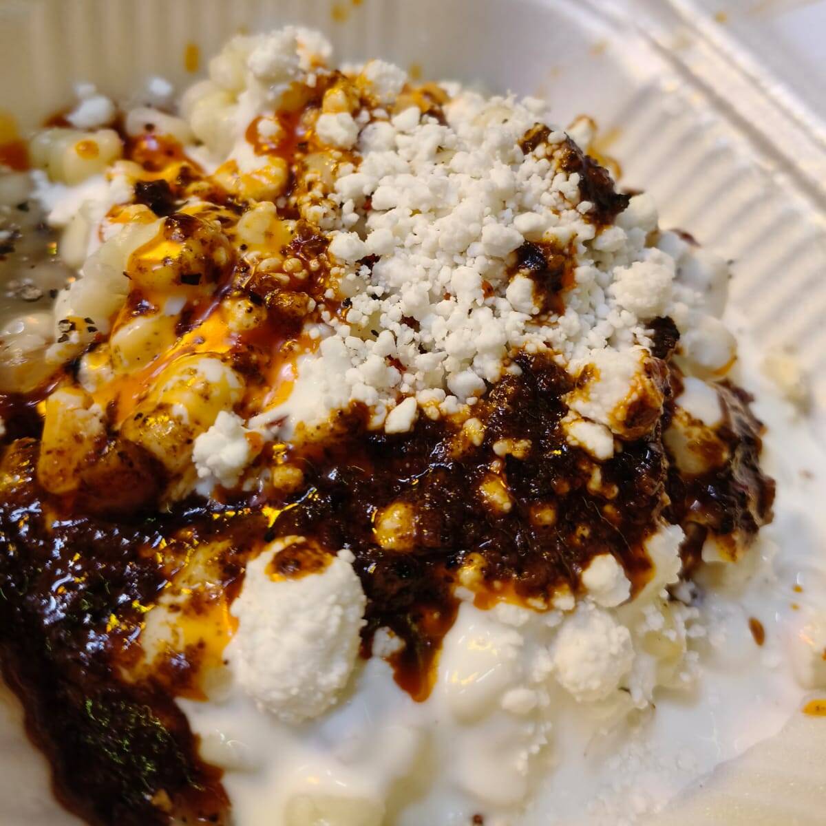 Elote, queso, crema, mayonesa, queso amarillo, chile de arbol en aceite, aderezo de la huella del habanero