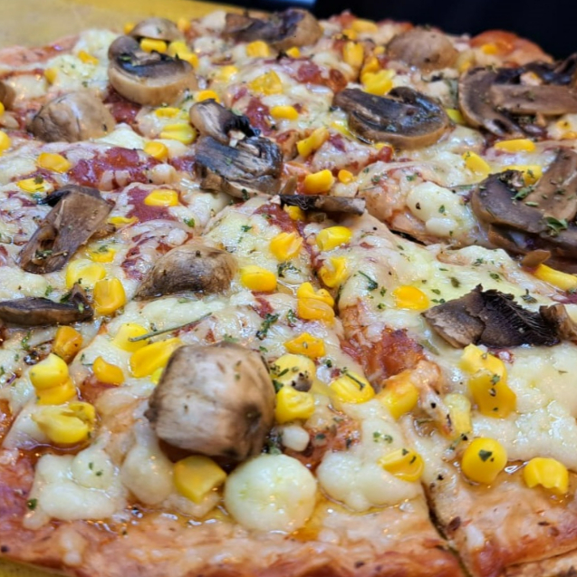 Pizza de vegetales al sartén de (30cm) con champiñones, elote y salsa Pomodoro