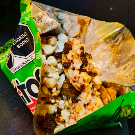 Tostitos, crema, mayonesa, queso amarillo, chile botanerito, y aderezo de la huella del habanero