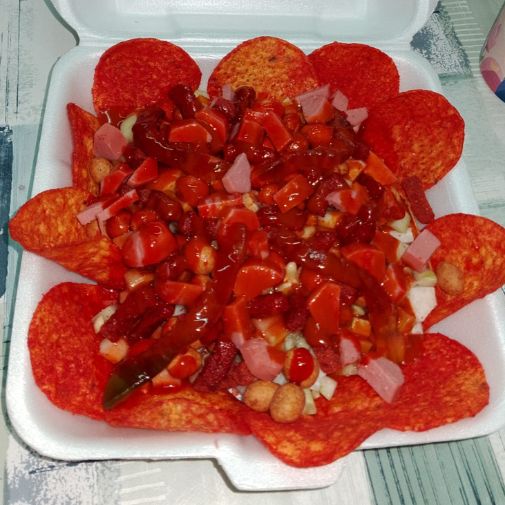 Carne de res, tocino, jamón, salchicha, queso, piña, jitomate, lechuga, cebolla, Jalapeño y papas