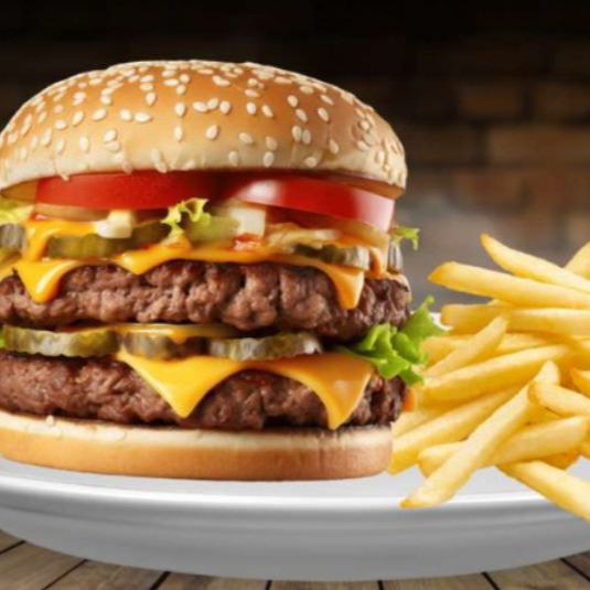 Doble carne de res, lechuga, jitomate, queso, cebolla, Jalapeño y papas