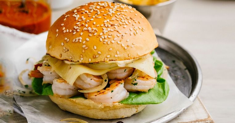 Hamburguesa de camarón y queso mozzarella, incluye jitomate, cebolla y lechuga. Se acompaña de mayonesa, cátsup y papas a la francesa.