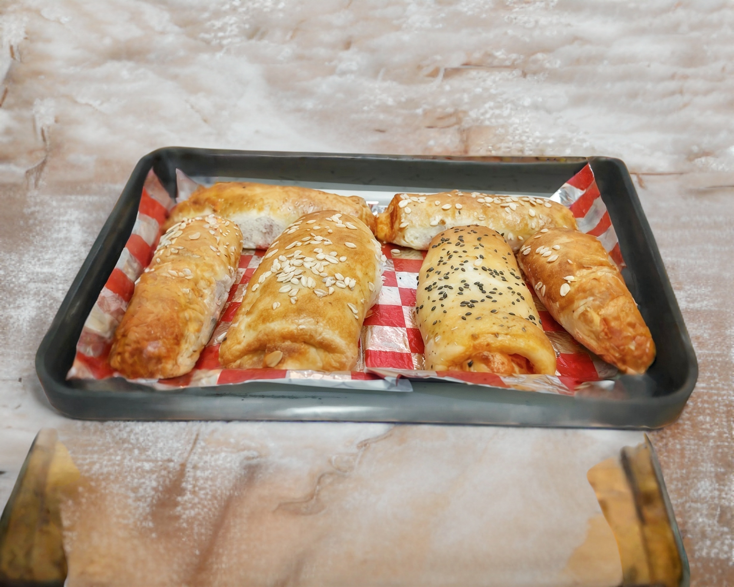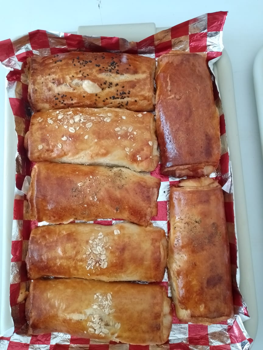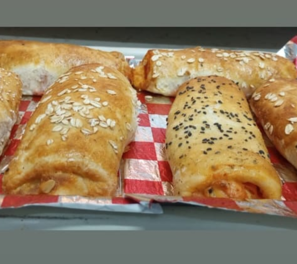 Delicioso rollo de pizza (18cmx9cm) hecho a mano, elaborado con una basé de nuestra salsa de tomate casera, salchicha de pavo y extra queso mozzarella. Horneado a 210°