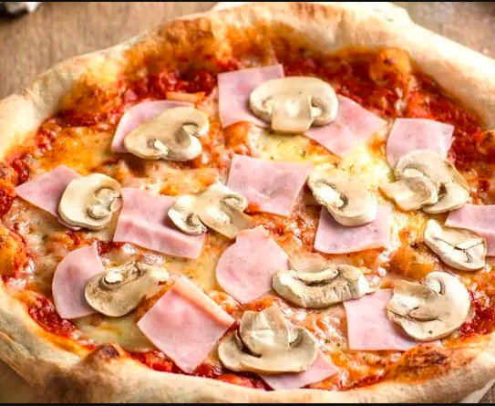 Salsa de tomate, mozzarella, jamón y champiñones, de 30 cm de diámetro.