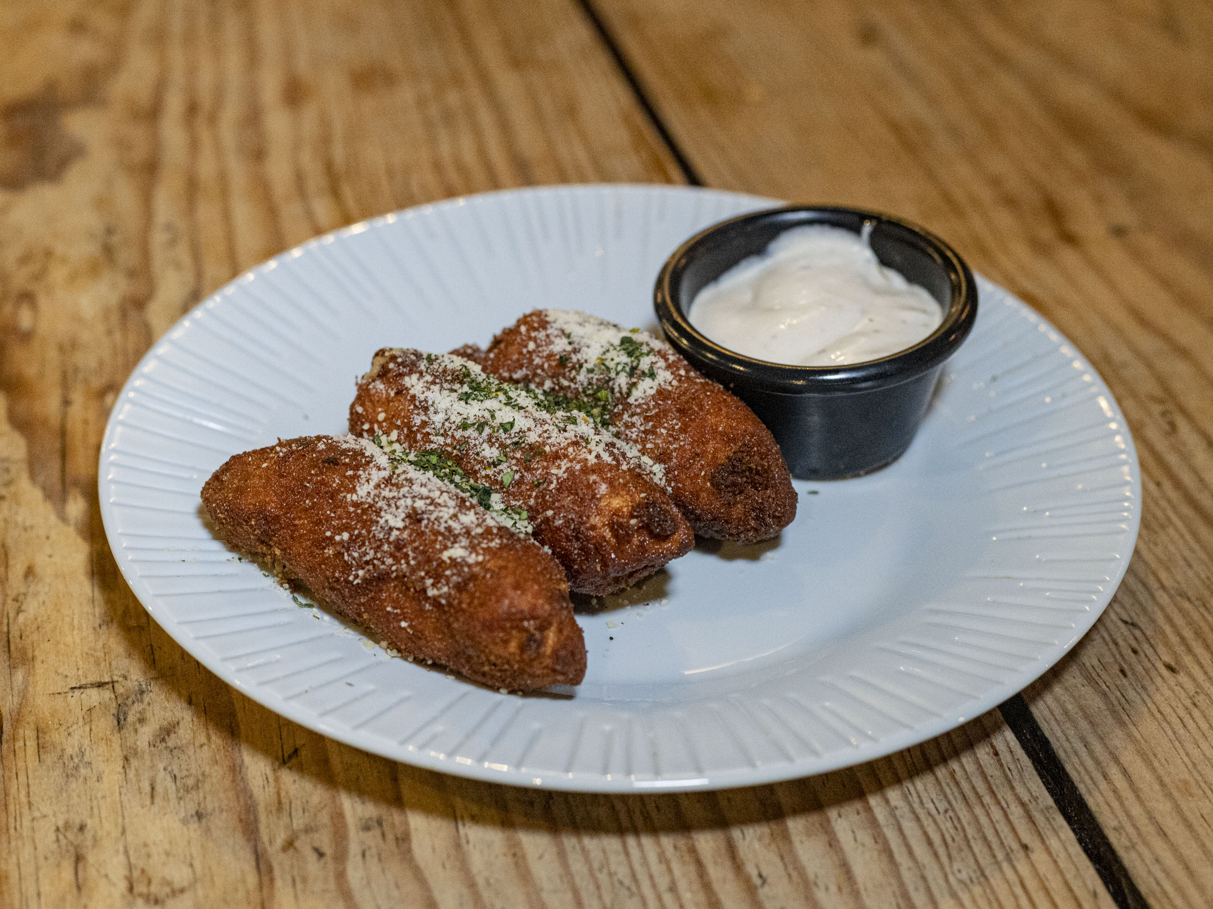 3 Tubos de queso empanizados y fritos acompañados de un dip picante