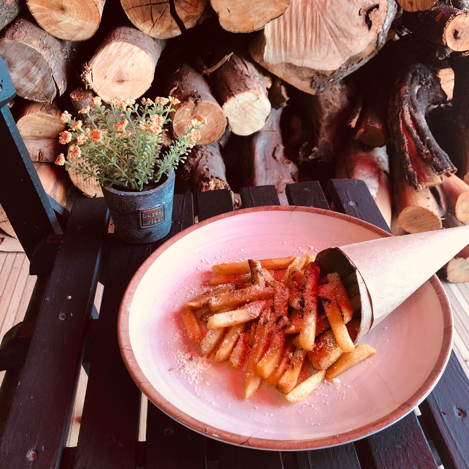 Papas a la francesa sazonadas con pesto hecho en casa con albahaca fresca, aceite de olivo, parmesano, nuez y ajo. Porción de 260 gr.