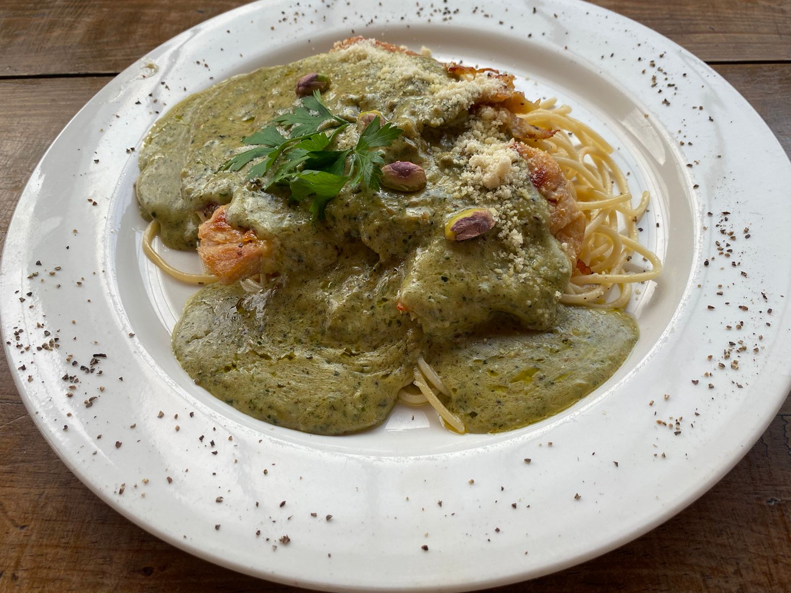 Camarones salteados con ajo y pesto al pistache de la casa , con pasta a la mantequilla y parmesano