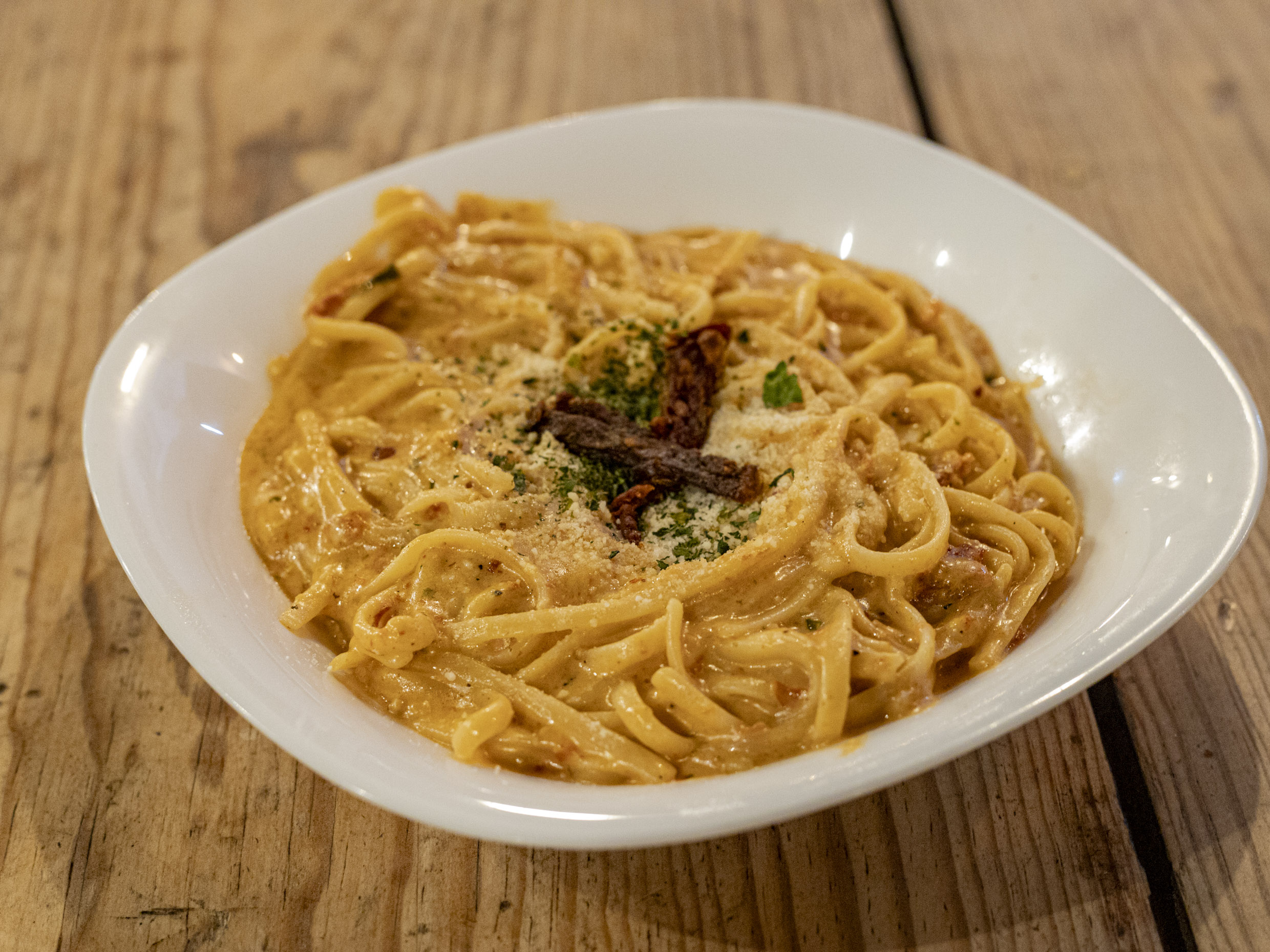 Hecha con pesto de tomate deshidratado, parmesano, ajo, aceite de oliva y almendras.
