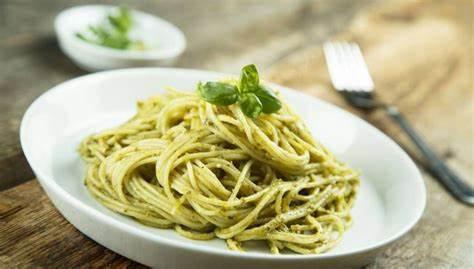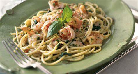 Camarones salteados con ajo y pesto genovesse de la casa, con pasta a la mantequilla y parmesano