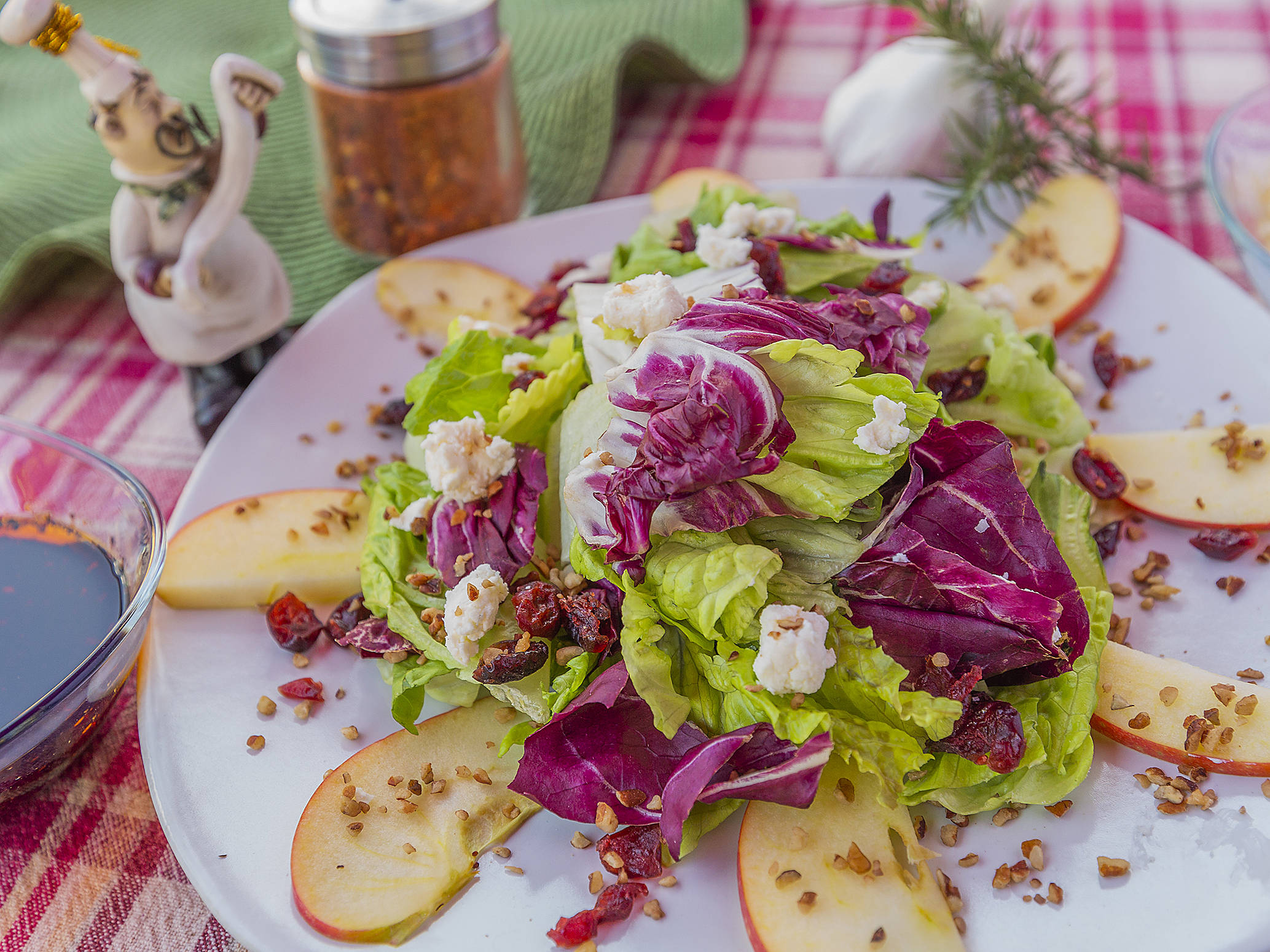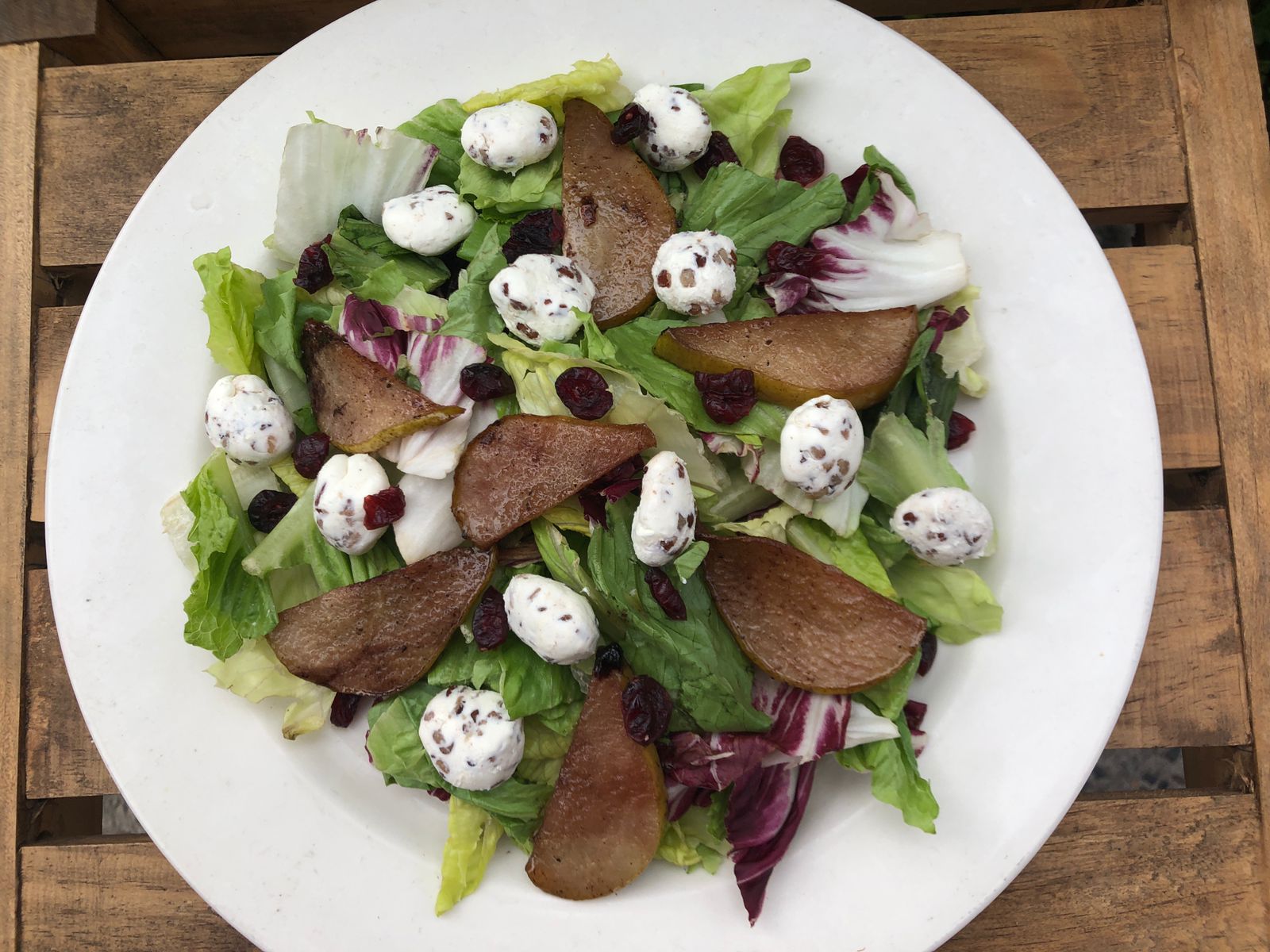 Mezcla de lechugas con peras al merlot y canela, acompañada de queso, almendras y vinagreta balsámica a los frutos rojos.