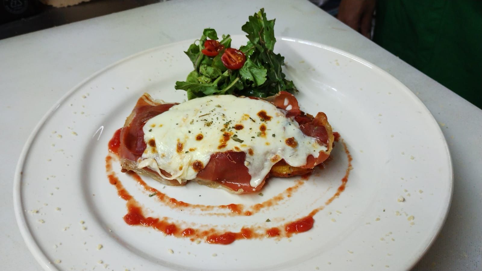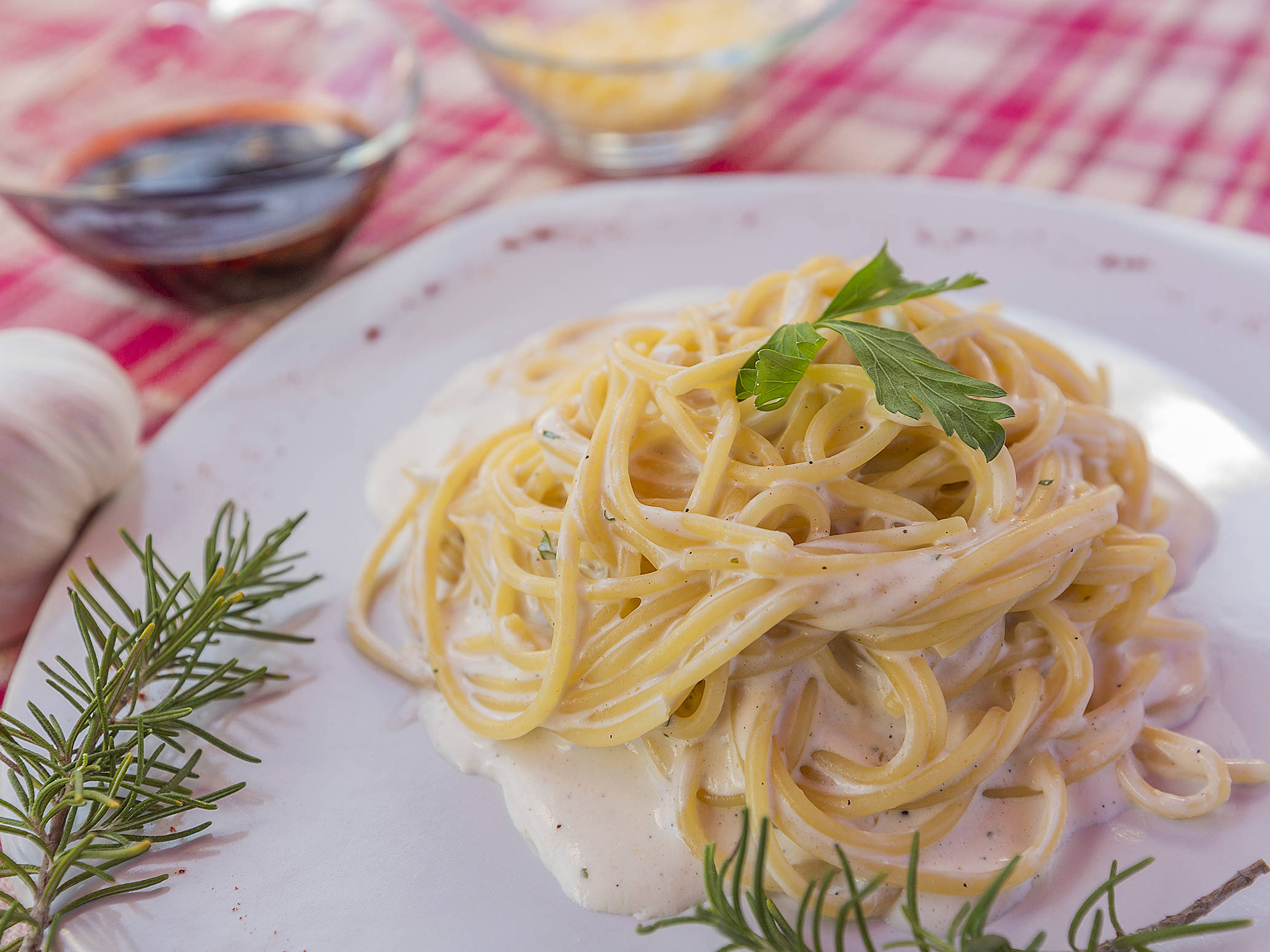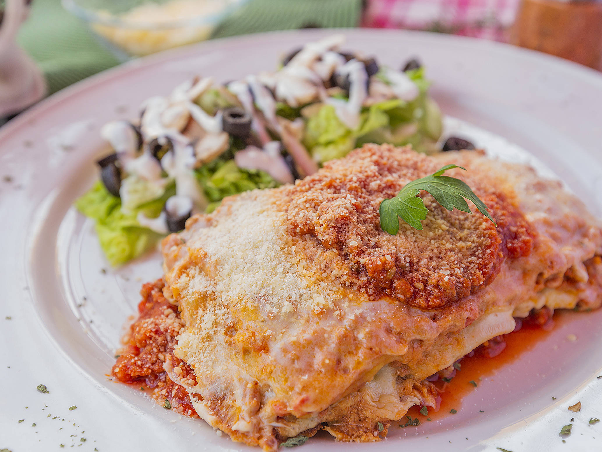 Laminas de pasta con salsa bolognese, crema de la casa y parmesano.