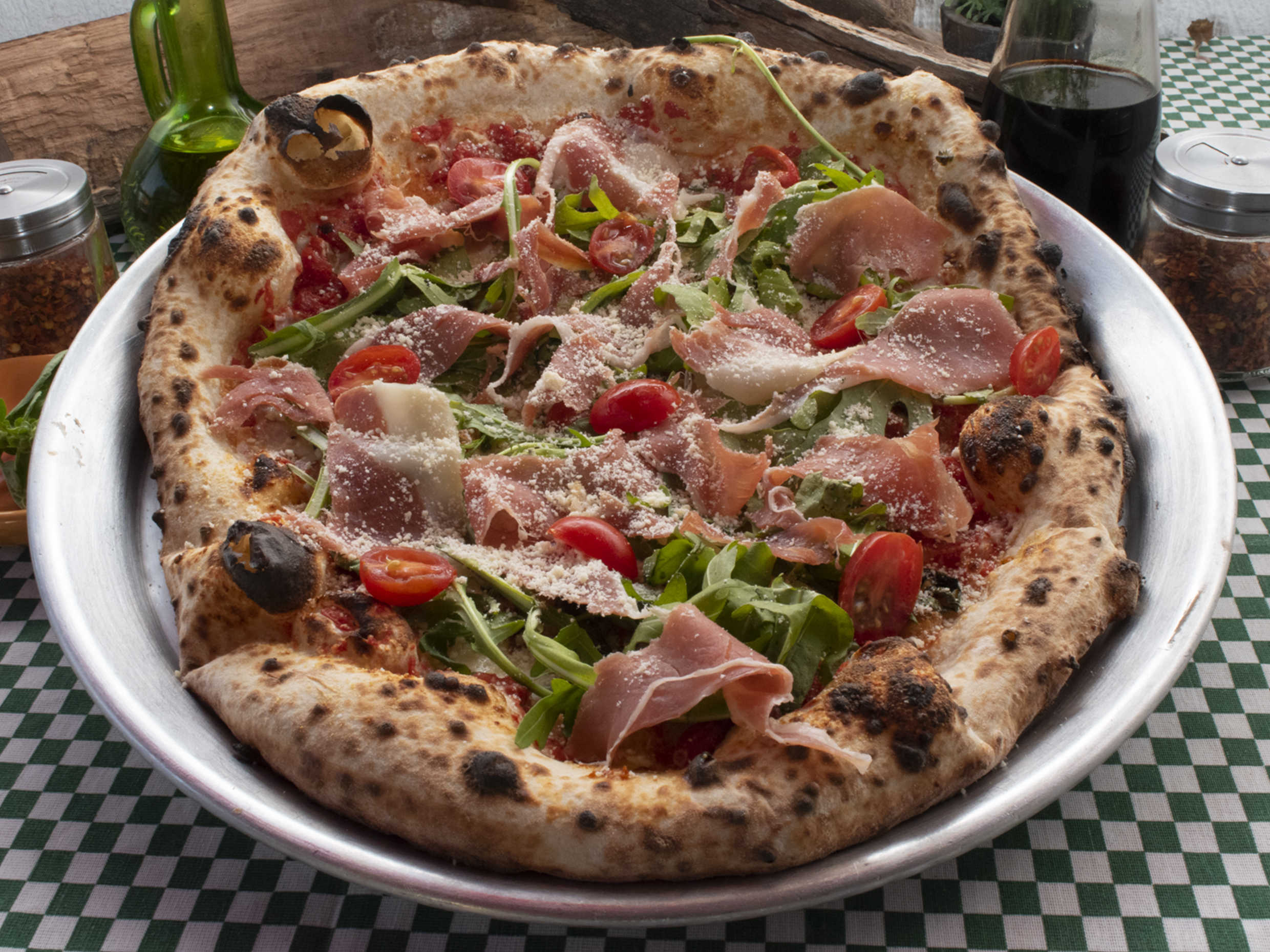 Salsa de tomate, mozzarella, parmesano, jamón serrano, jitomate cherry y arúgula fresca.