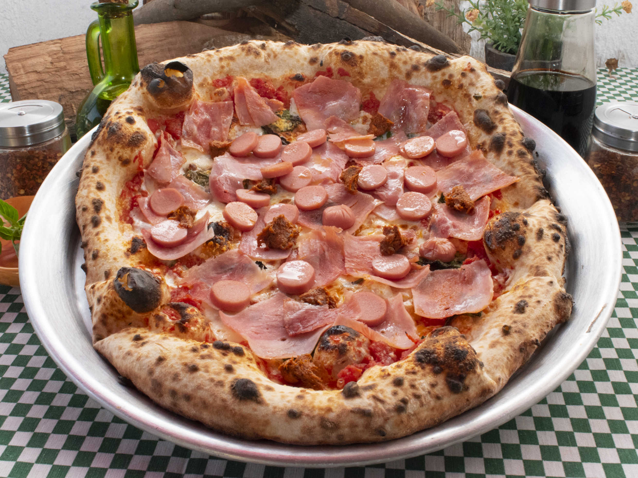 Salsa de tomate, mozzarella, jamón, chorizo, salchicha. De 30 cm de diámetro.