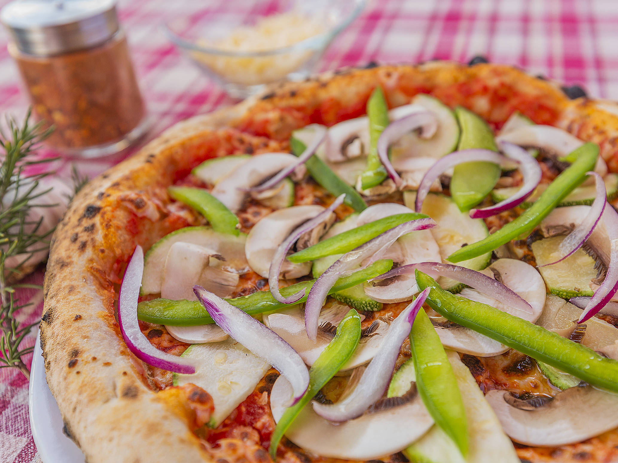 Tomate, mozzarella daiya, champiñones, calabaza, pimientos , cebolla morada y aceite de olivo.