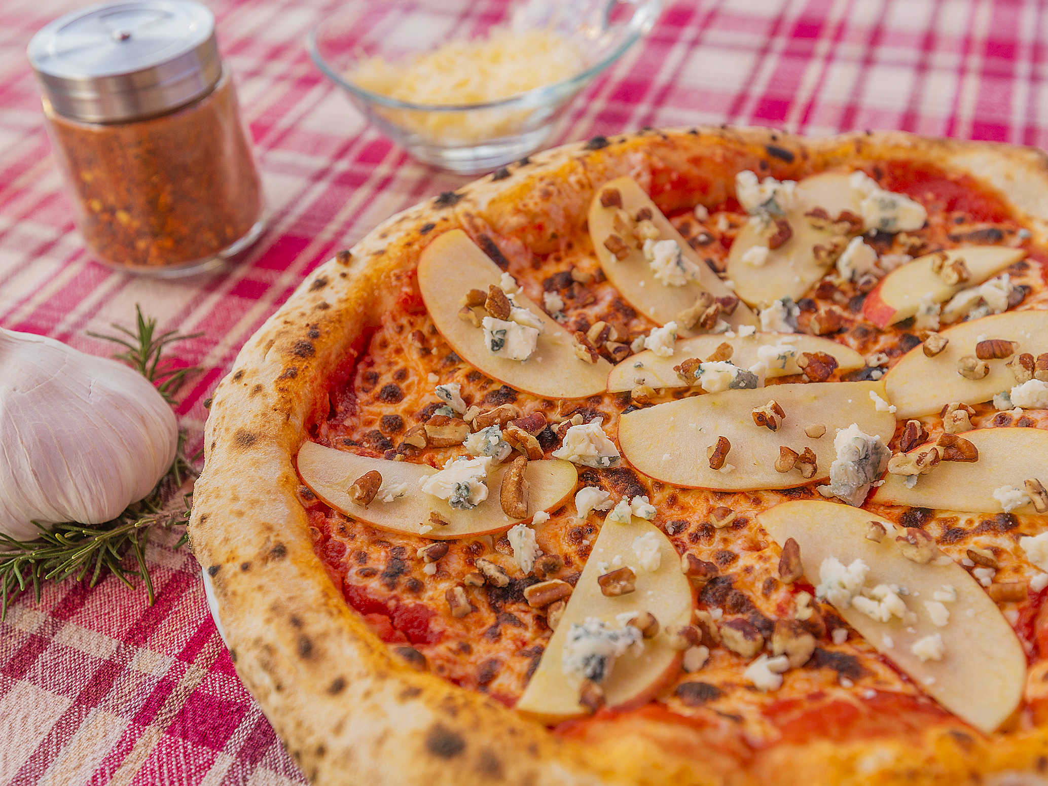 Salsa de tomate, mozzarella, queso de cabra, arándanos y alcachofas. 30 cm de diámetro.