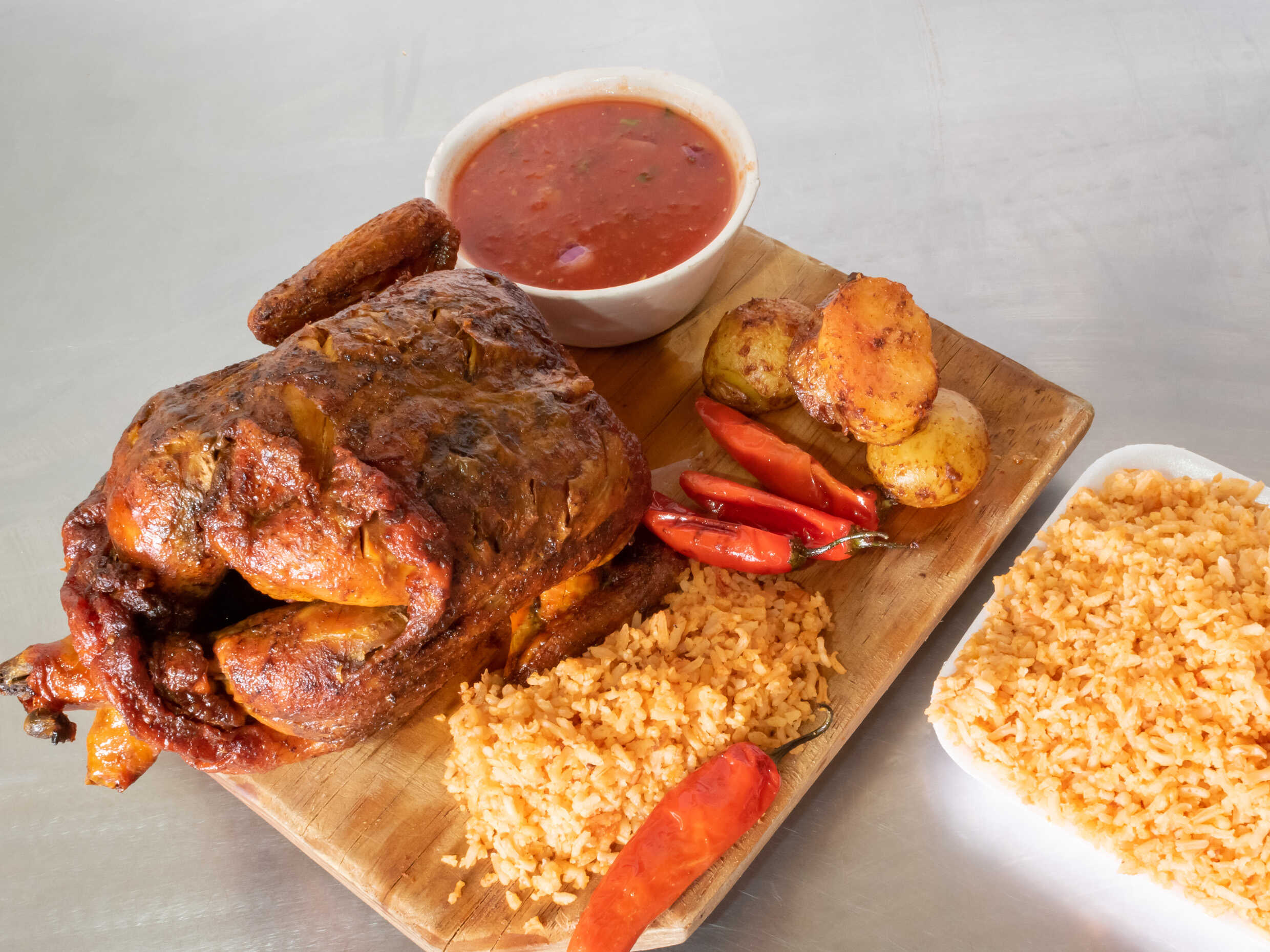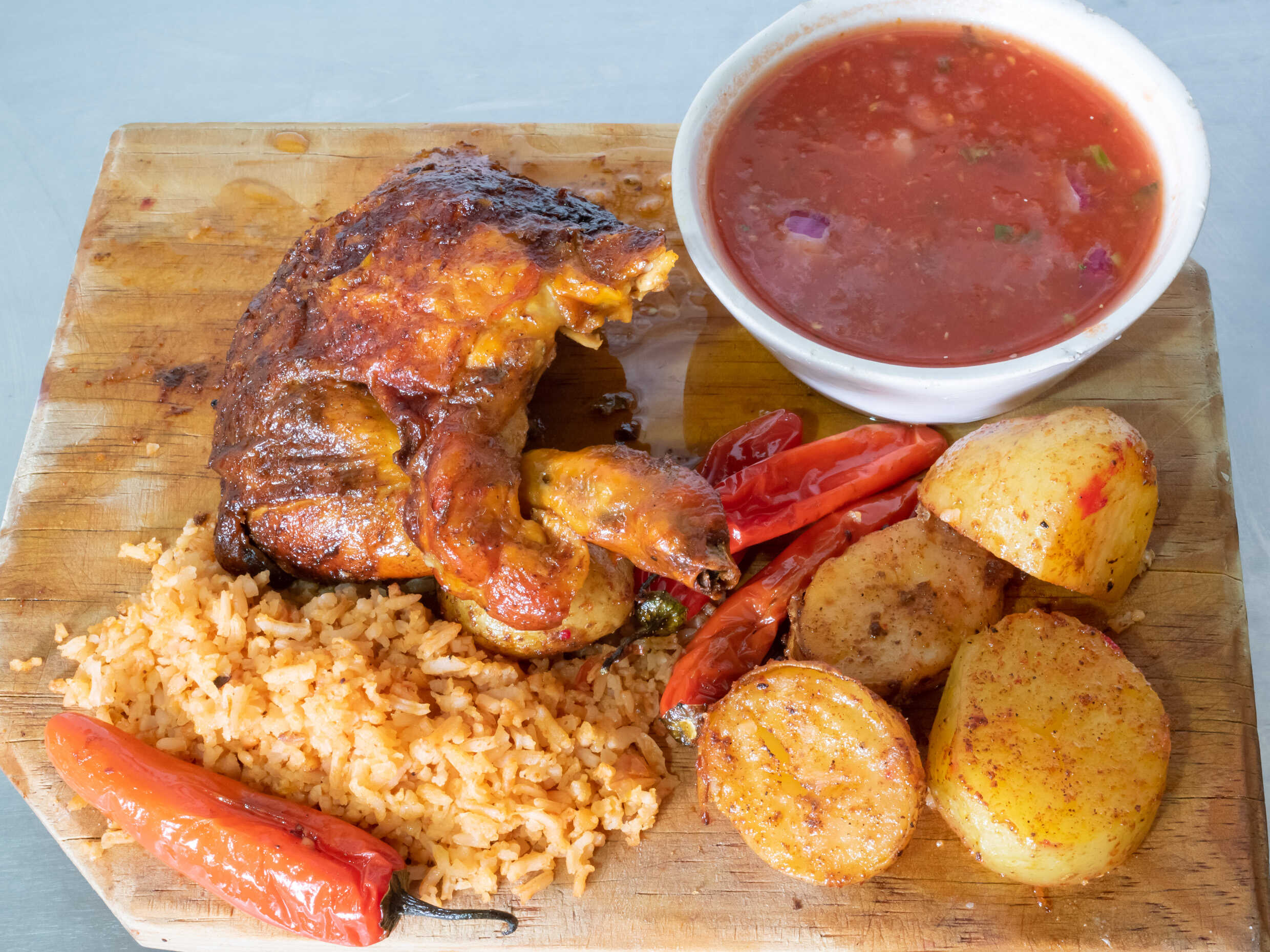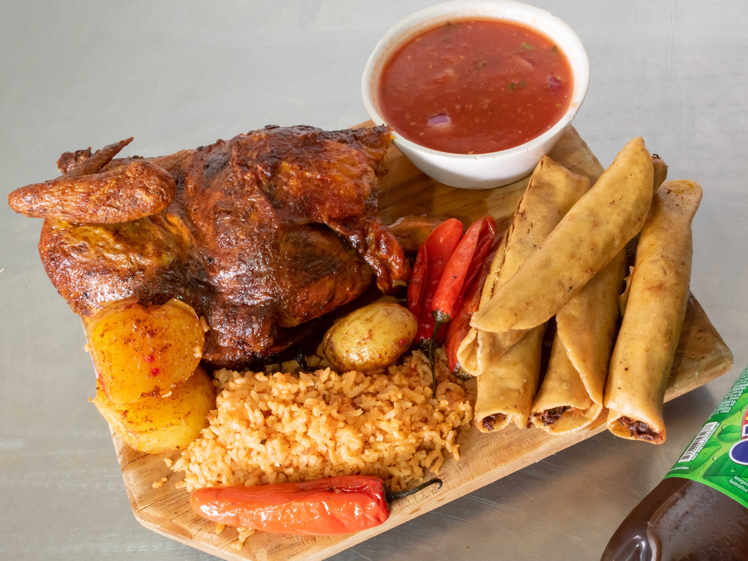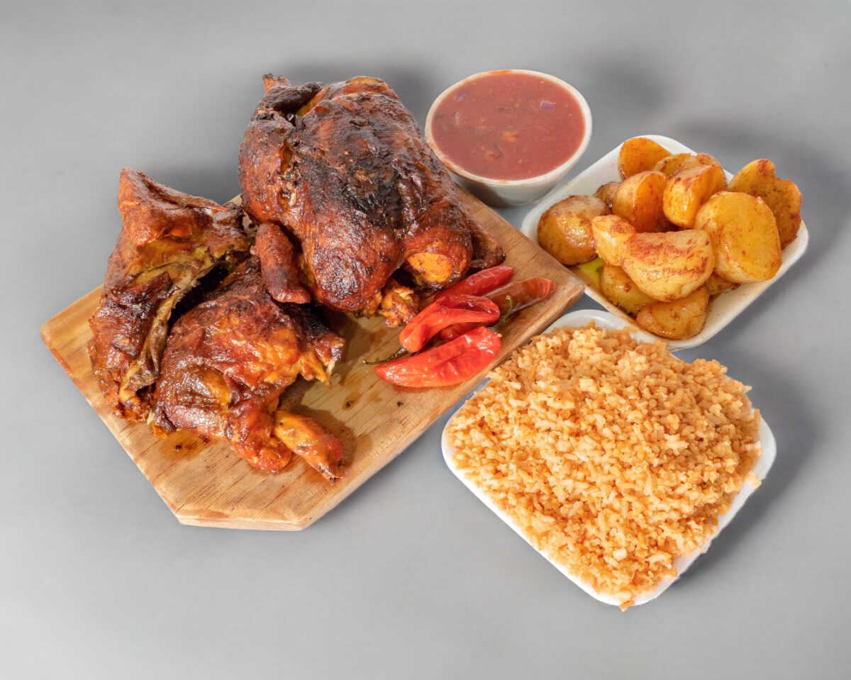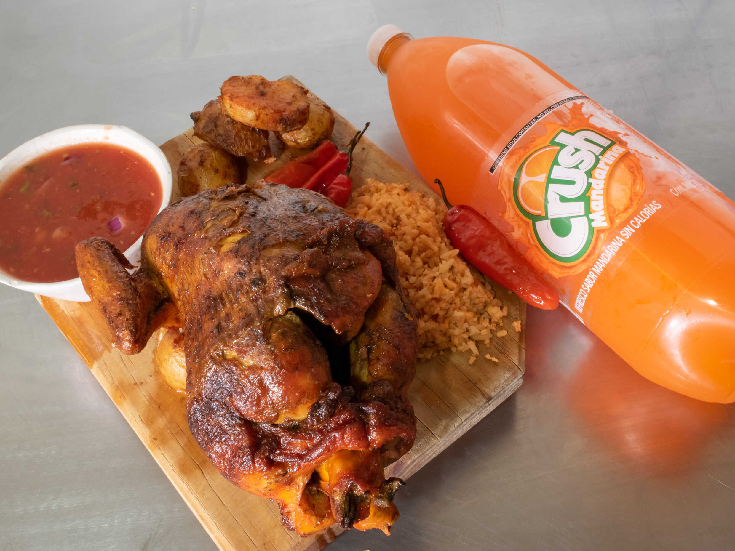 1/2 Pollo, + 1 Ref. 600 Ml. Acompañado de papás chiles arroz salsa y tortillas