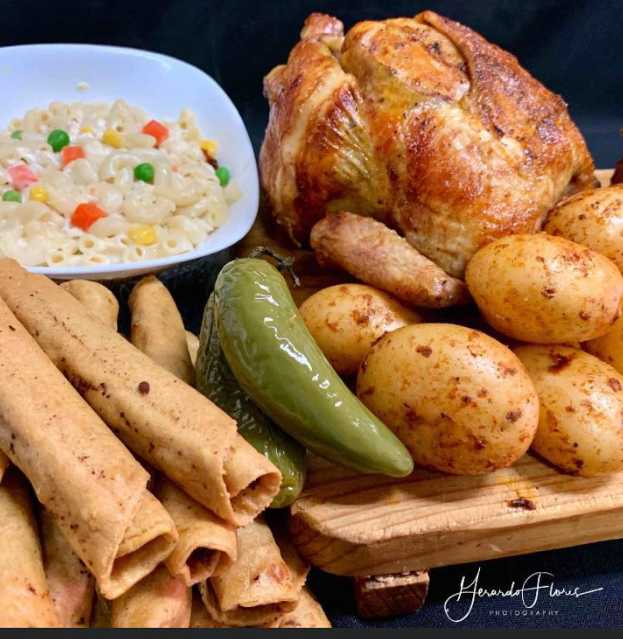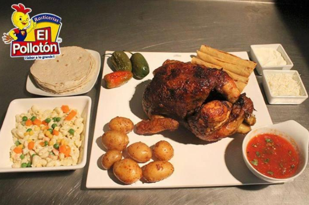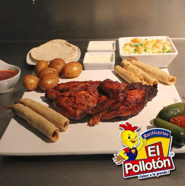 1 y 1/2 pollos, 10tacos y 1 orden de papas. Acompañado de arroz, tortillas, salsa y chiles toreados