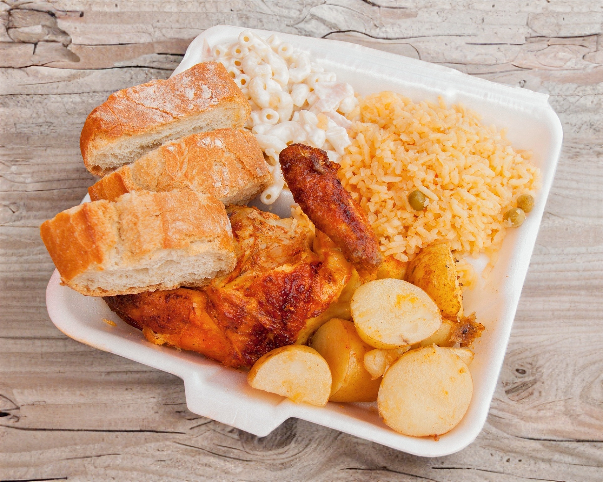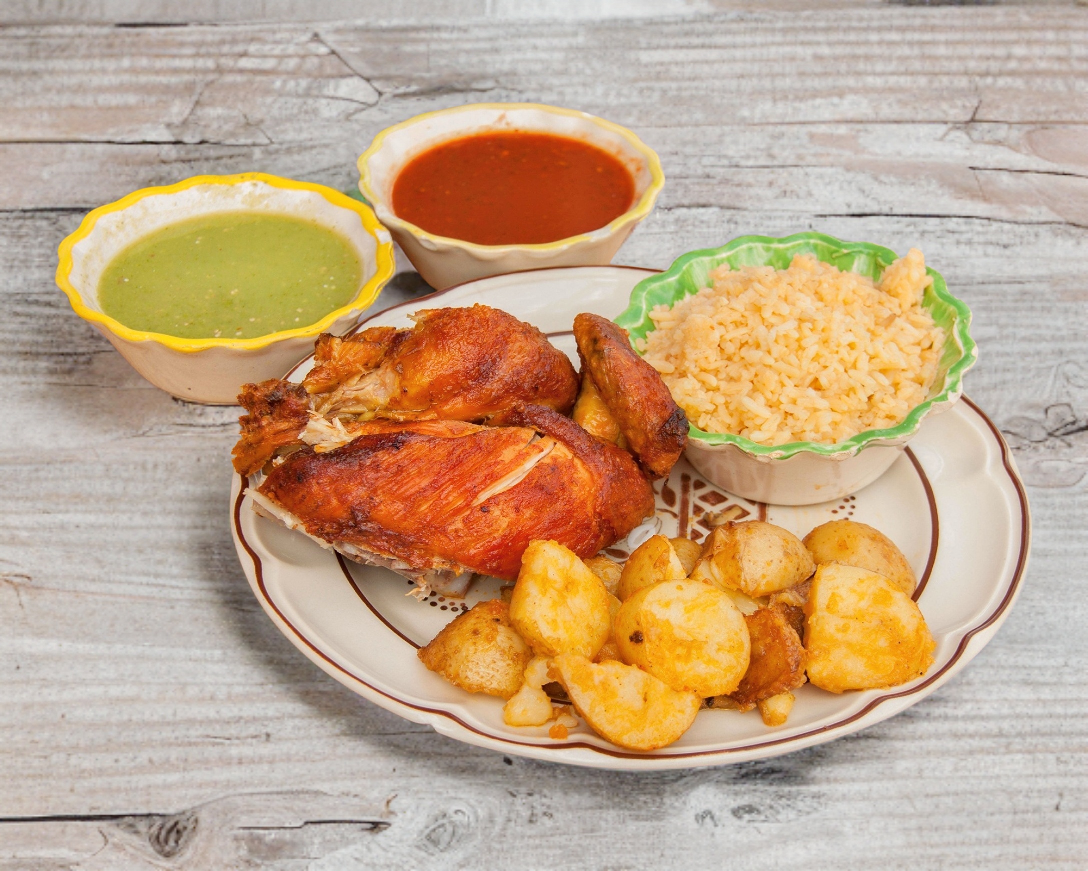 3/4 de pollo, acompañado de sopa de arroz, salsa verde y roja y papas