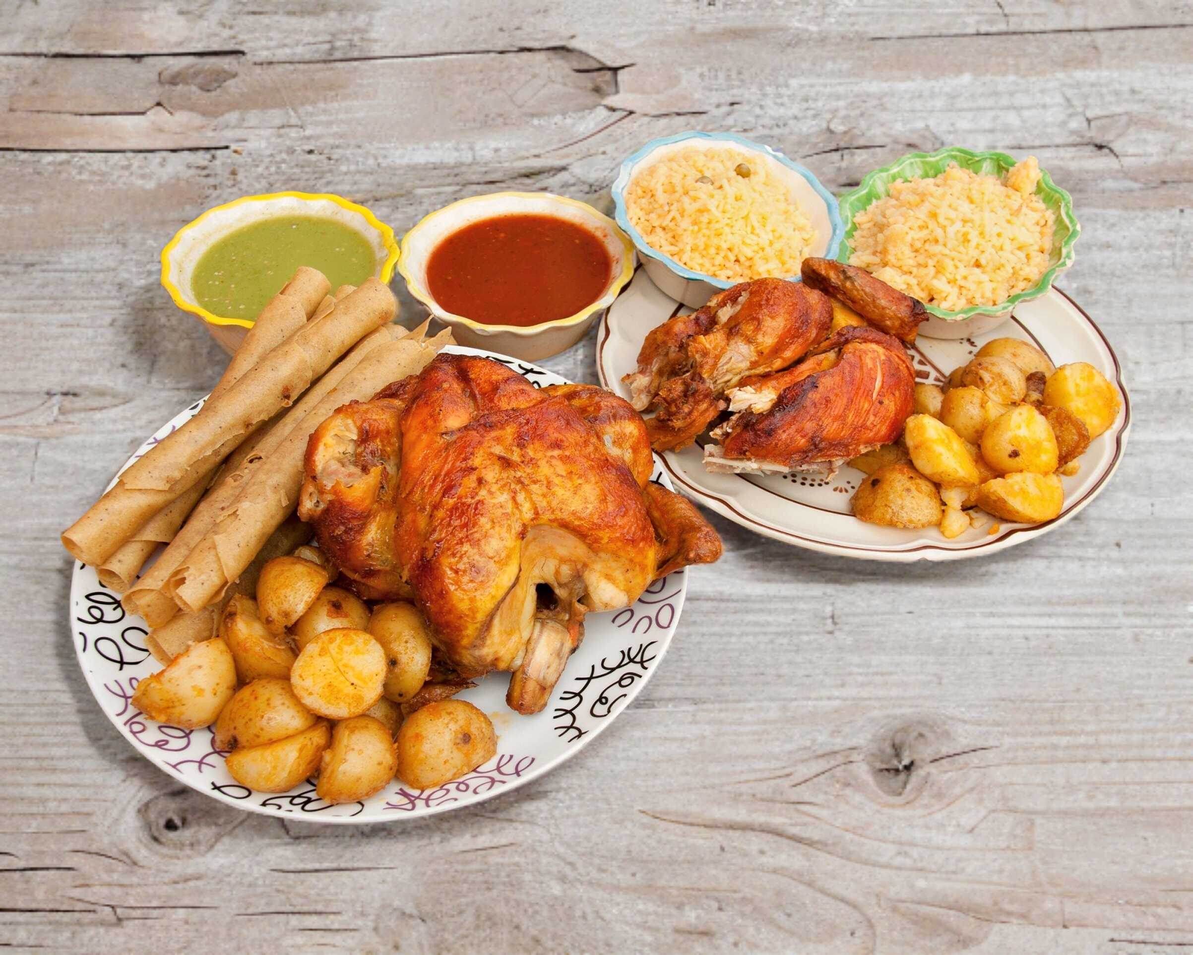 Un pollo y medio 2 sopas de arroz salsas verde y roja , papas, 6 flautas