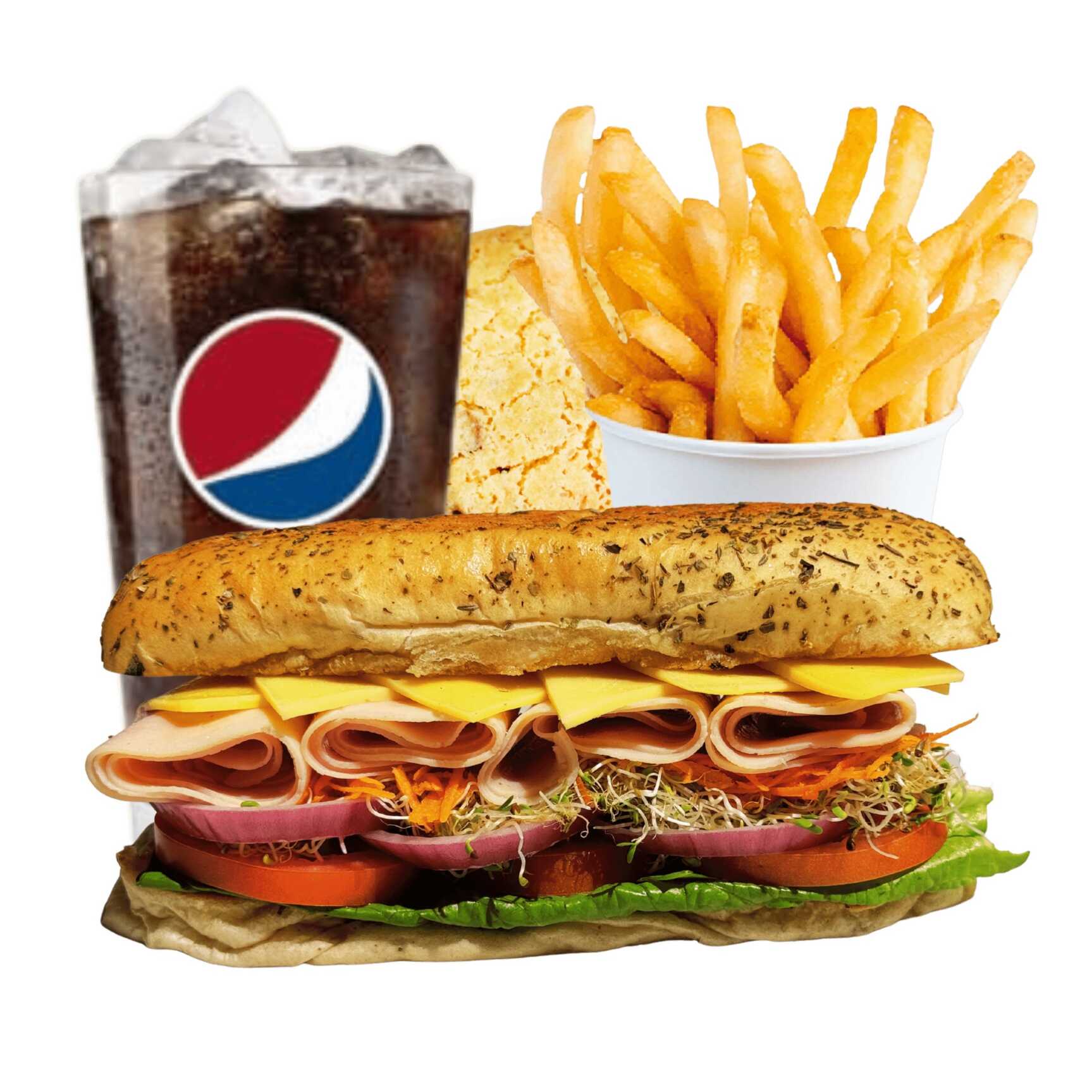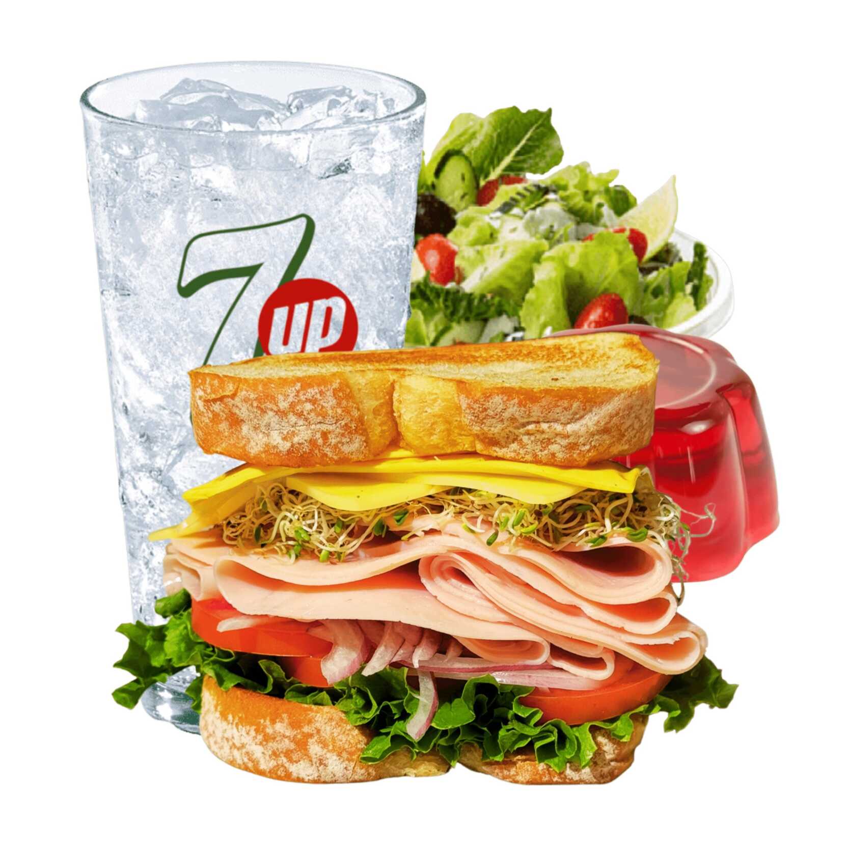 Sandwich de Pan Artesanal con Jamón de Pechuga de Pavo, Queso Manchego, Lechuga, Jitomate, Cebolla y Germinado de Alfalfa acompañado Papas a la Francesa, Catsup, Jalapeños, Postre y Bebida a Elegir.
