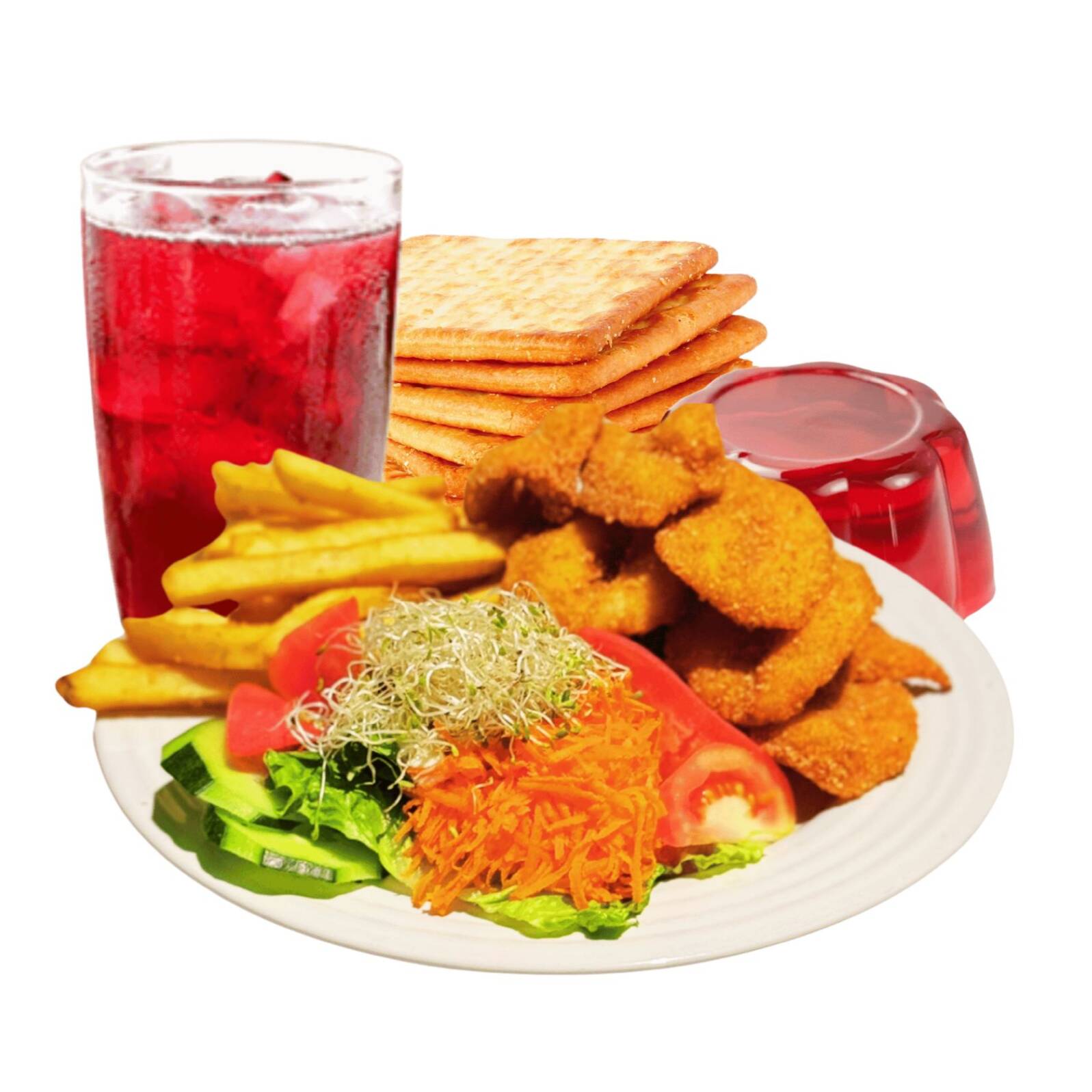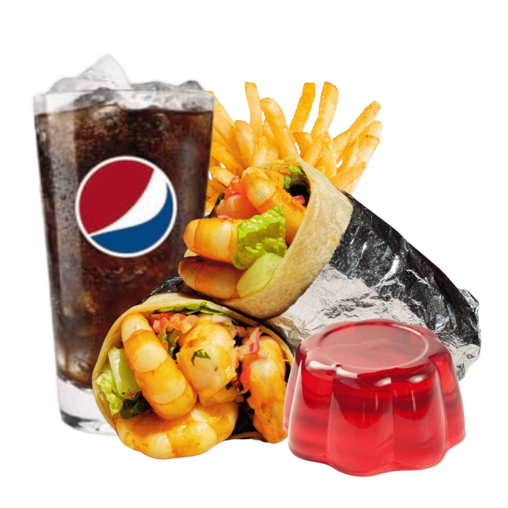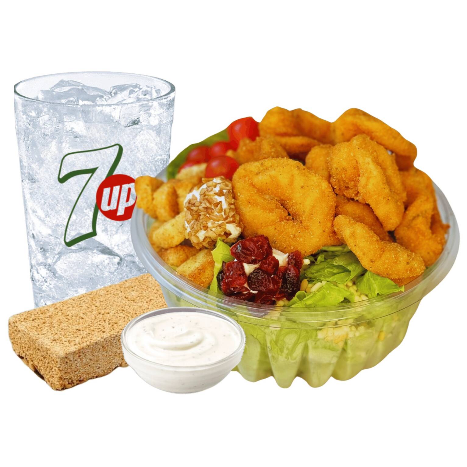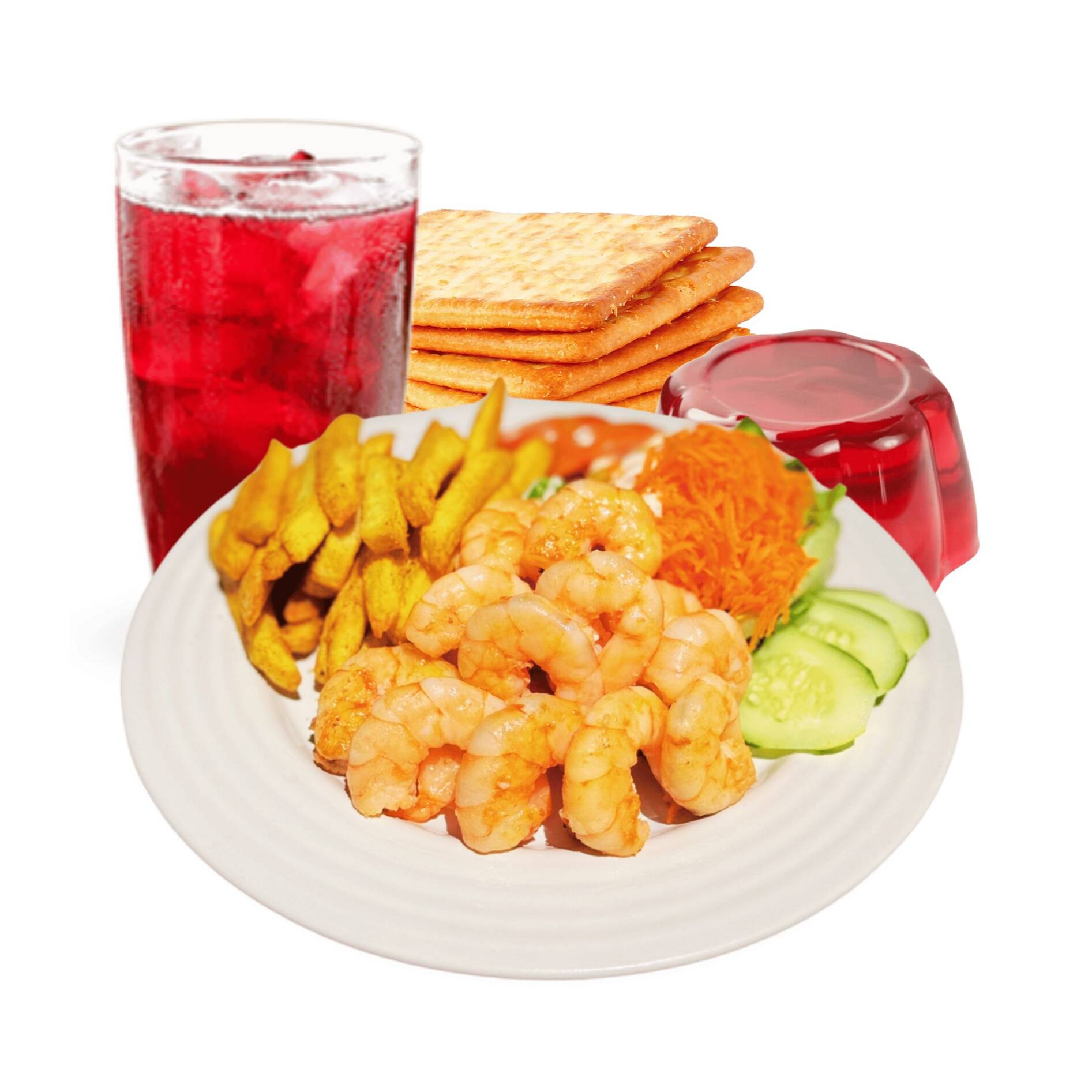 Camarones Empanizados acompañados de Papas a la Francesa, Ensalada César, Galletas Saladas, Salsa Catsup con Bebida y Postre a Elegir.
